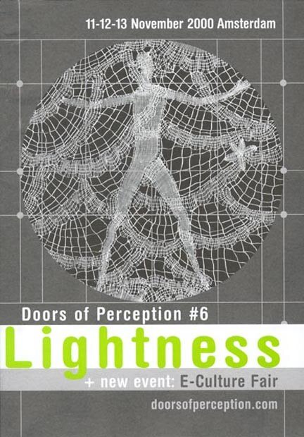 Doors of Perception, citazione blakeiana, è dal gennaio 2000 una fondazione indipendente no profit. Trovare modalità che riducano il flusso di energia e materia nella nostra vita quotidiana è un’interessante opportunità per il design, da qui il tema di Doors of Perception 6: LIGHTNESS. L’argomento seguirà nelle tre giornate tre linee di sviluppo: Dimensions of lightness, Perceptions of Lightness e Applications of Lightness.