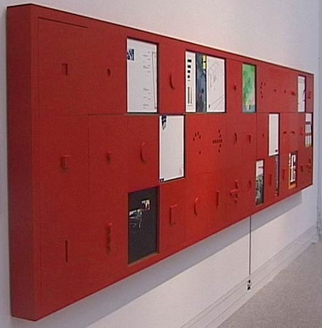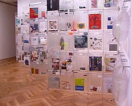 Lo scaffale di Grcic è superdimensionato e contiene cartellone di presentazione dei suoi lavori