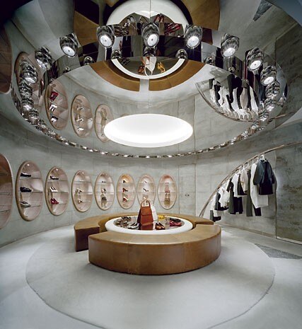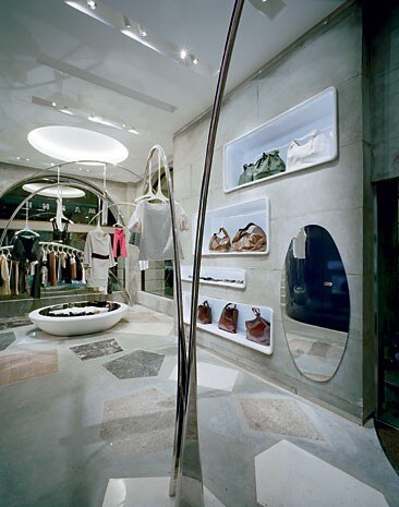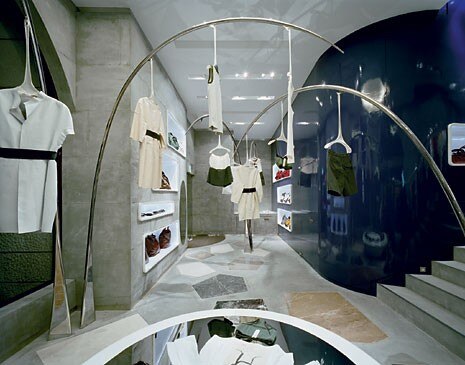La scelta delle finiture della pavimentazione gioca un ruolo importante nella definizione delle aree del negozio e intensifica l'effetto glamour: a zone che utilizzano il solo calcestruzzo succedono aree con pavimentazione levigata su cui viene distribuita una varietà di pietre e marmi a colori casuali, oppure altre che combinano marmo bianco e calcestruzzo. Fluide rotaie di acciaio inossidabile che sorreggono le collezioni prêt-à-porter affiancano gli espositori alle pareti, scivolano sopra l'imponente scalinata di calcestruzzo fino a uno spazio curvilineo e separato, destinato alle calzature, che ha al suo centro un unico espositore circolare rotante circondato da poltroncine di cuoio.
