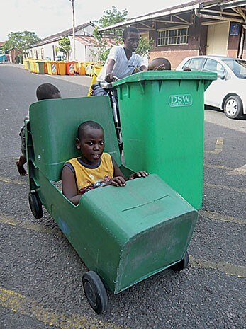 Sedie rotte, copertoni consumati, vecchie celle frigorifere, biciclette scassate e arrugginite: tutto è fonte di ispirazione per questi due "architetti della spazzatura", come loro stessi amano definirsi, che, lavorando al confine tra design, arte e architettura, inventano nuovi prodotti da vecchi materiali. La loro missione consiste nel trovare idee innovative per lo spazio pubblico (e privato) con materiali locali di scarto. Invitati a Durban, in Sudafrica, lo scorso febbraio, da Cascoland organizzazione artistica olandese che suggerisce alle comunità locali spunti per utilizzare lo spazio pubblico, hanno per esempio rivolto la loro attenzione ai bidoni della spazzatura, oggetti dalla vita media molto limitata che, una volta rotti, vengono subito sostituiti. Mantenere la mobilità dell'oggetto e anzi enfatizzarla, aggiungendo nuove funzioni è stata l'idea alla base del loro progetto. Equipaggiato con autoradio, casse e batterie dell'auto il bidone è diventato una stazione mobile per dee jay set (bin band); davanti a una bicicletta si è trasformato in un funzionale mezzo di trasporto per merci (bin bike); infine tagliato e riassemblato ha dato vita a un divertente gioco per i bambini (bin toy) o a una comoda seduta (bin chair). Elena Sommariva