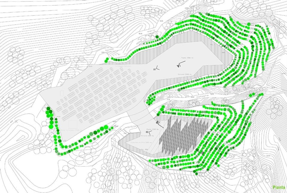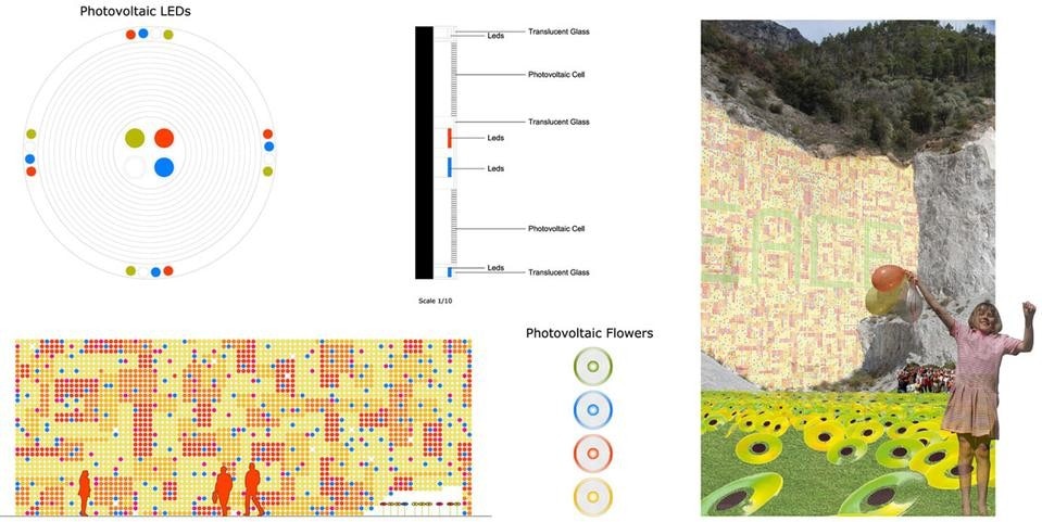A seconda della geometria, dell'orientamento e delle esigenze specifiche del fronte delle cave sono state sviluppate diverse tecniche innovative di messa in sicurezza, mitigazione dell'impatto e rinaturalizzazione: corde di canapa agganciate dalla sommità della cava al piano di base per favorire la crescita della vegetazione sia dal basso che dall'alto; reti a maglie larghe in fibre naturali e composite che ricompongono artificialmente il profilo originario della montagna sostenendo allo stesso tempo la vegetazione; cavi metallici sospesi dall'alto ed appoggiati alla roccia con integrate cassette in legno che alloggiano piante rampicanti e discendenti; impalcature leggere realizzate in tubi innocenti riciclati con inseriti nei piani orizzontali sacchetti di juta per supportare la crescita di piante spontanee ed autoctone. Anche il sistema di finanziamento prova ad essere all'insegna della sostenibilità. Gran parte di questo ambizioso masterplan si dovrebbe infatti autofinanziare grazie al mercato dell'anidride carbonica per il suo efficacie contributo alla riduzione globale di emissioni. Inoltre tutta l'energia utilizzata sia per la gestione delle attività diurne e notturne degli spazi pubblici recuperati, compresa quella necessaria per la realizzazione di proiezioni e luci artistiche, sarà autoprodotta utilizzando piccoli pannelli solari integrati e una serie di microturbine eoliche e idrauliche integrate nelle infrastrutture che sostengono la rinaturalizzazione. In alcune cave si reinterpretano inoltre le tradizionali luminarie religiose locali utilizzando i nuovi led a bassissimo consumo. Tutti gli elementi in pietra utilizzati per la pavimentazione ed il recupero dei grandi piazzali di cava saranno simbolicamente realizzati in pietra artificiale ricostruita con la stessa tessitura, grana e colore delle storiche e preziose pietre locali di Teggiano e Padula oggi non più disponibili. E.S.