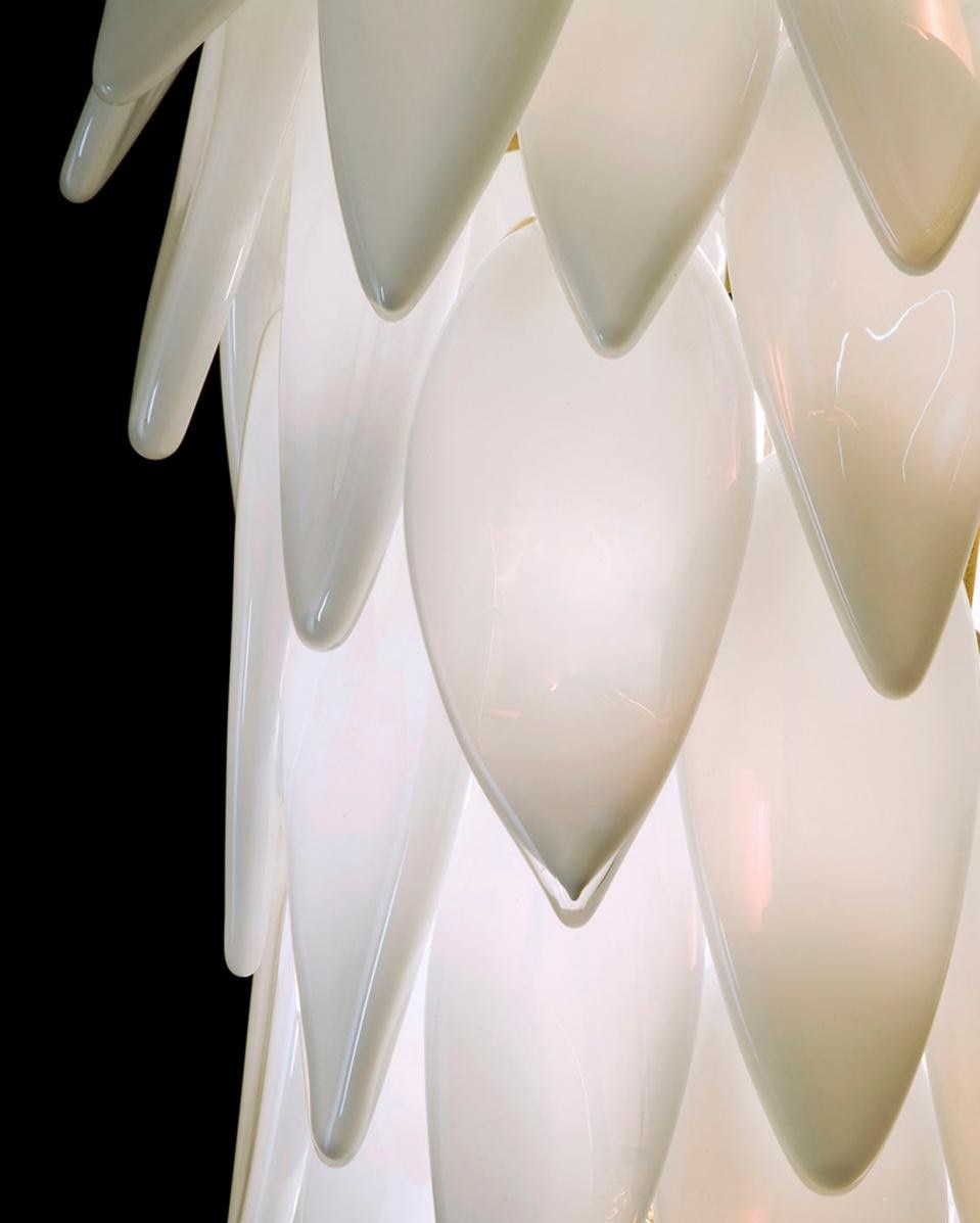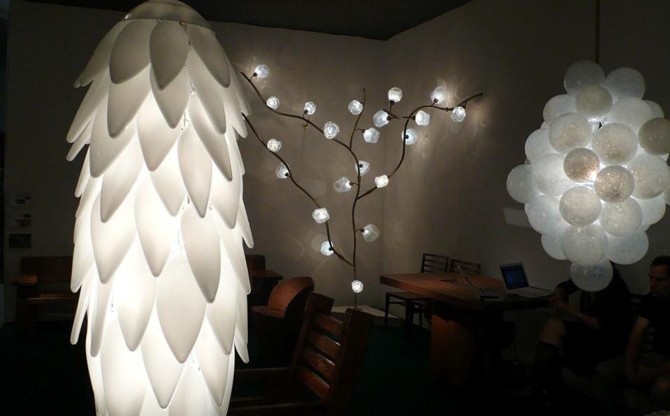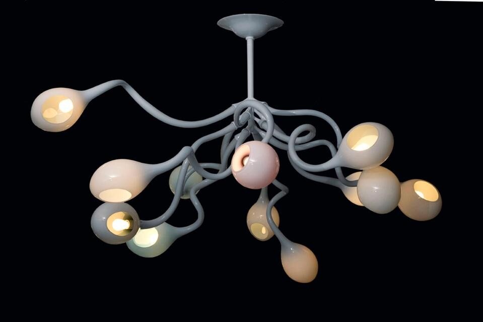 J. Z.: Si, assolutamente. Il vetro colorato è meraviglioso, molto caldo. Mentre si soffia il vetro, il colore viene aggiunto a poco a poco, così si può deciderne l'intensità e la luminescenza. Ciò a cui presto maggiormente attenzione è l'esatta quantità di colore che determina la nuance. Mi piace giocare con la quantità di pigmento, ad esempio l'azzurro diluito con acqua o olio dà una leggera luce e lascia intravedere il bianco al di sotto. Utilizzo la densità dei bianchi per rendere le diverse qualità della luminescenza che può essere più opaca o più traslucida. I miei pezzi sono tutti bianchi, ma c'è un colore nascosto all'interno. In questo lampadario a grappolo ho usato della baking soda, l'ho aggiunta per produrre dei buchi sulla superficie del bianco e allo stesso tempo ha prodotto del blu e dell'arancione intorno. È come disegnare, avanzo per esperimenti, inizio facendo una cosa e la lascio crescere. Il modo in cui disegno il vetro è lo stesso modo in cui le cose crescono in natura, ammettendo degli errori. Gli alberi sono sempre perfetti d'altronde, non esistono alberi sbagliati!