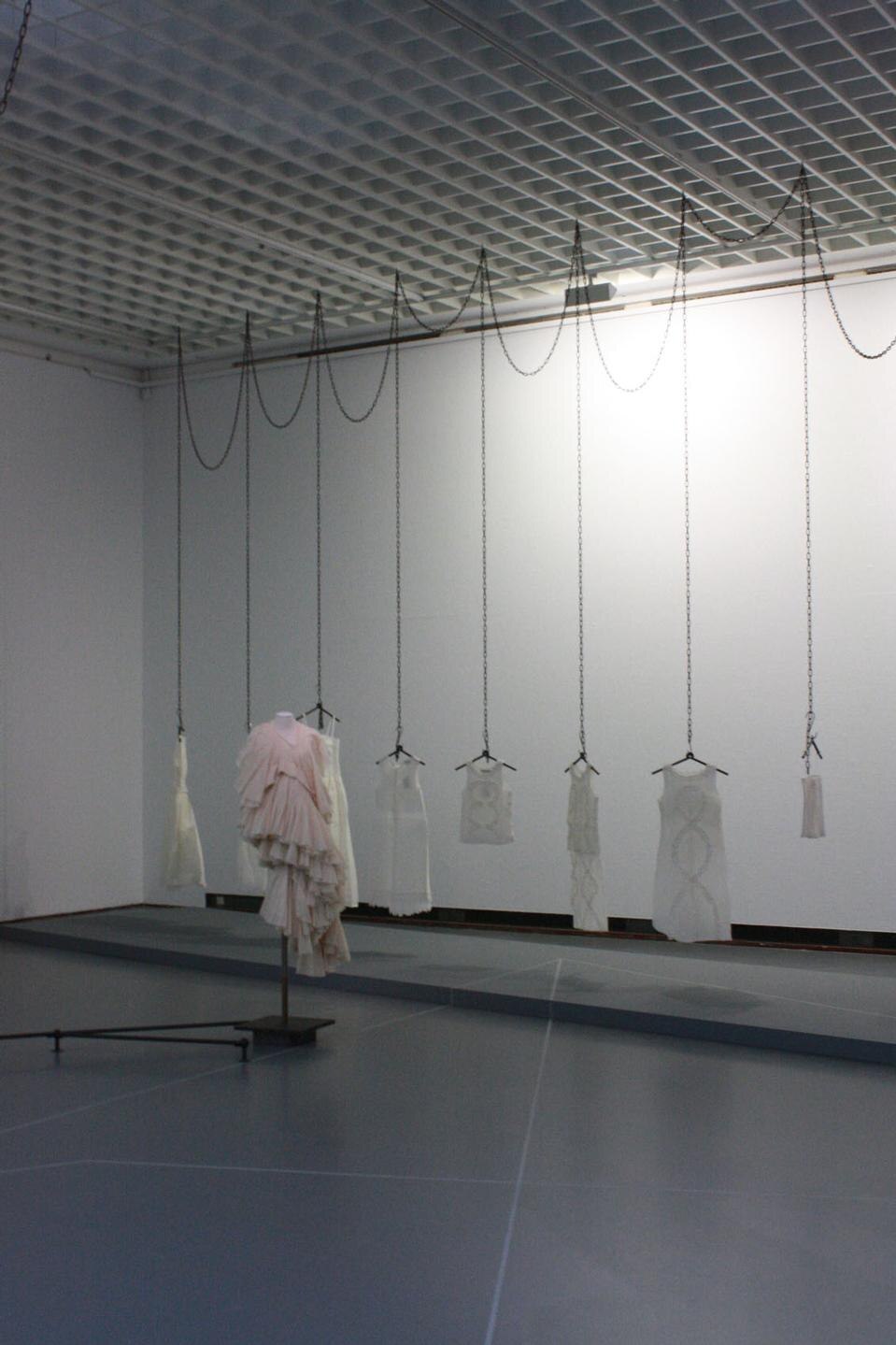 Non si può sfuggire alla propria storia e al proprio contesto, scorrendo l'elenco degli stilisti, con molti dei quali ho collaborato per oltre 10 anni. Dai Rees, Simon Thorogood, Naomi Filmer hanno conservato la loro inclinazione concettuale, spesso finanziando la loro attività con il lavoro accademico, e Anna-Nicole Ziesche, il cui lavoro è intransigente e profondo, la prima studentessa a laurearsi al MA Fashion at Central Saint Martin con un film anziché una collezione; è stato entusiasmante inserirli in una trama più ampia. La mostra, come tutte le mostre, rivela le affinità e fa emergere le preferenze del curatore. Feminist Art, installazione dei primi anni Settanta, è saltata fuori nelle conversazioni innumerevoli volte (è dove ci sono più sperimentazioni concettuali che utilizzano l'abito, per ovvie ragioni) e la mostra, dato che riguarda l'allusione, consente di seguire un corso di pensieri e di popolarlo con altri oggetti degli elementi della mostra: per esempio, so che il modo in cui sono drappeggiate le catene che sostengono l'opera di Dai alludono ad Untitled Rope di Eva Hesse, del 1970 – a cui ho pensato quando ho visto l'installazione di Francesco Vezzoli per Greed, al Gogosian che tu, Maria Luisa mi hai portato a vedere a Roma, dove uno dei poster riproduceva Eva Hesse. Gli oggetti sono collegati da una storia personale – non è ovvio che le catene drappeggiate debbano avere un collegamento con una bottiglia di profumo nella sala accanto, ma questo è il modo in cui le mostre sono sempre organizzate, modi di cui il visitatore è soltanto parzialmente consapevole. Ecco perché, per me, è strano quando le mostre cercano di spiegare il significato con dei pannelli di testo – come se si potesse dare una spiegazione chiara delle vere motivazioni.