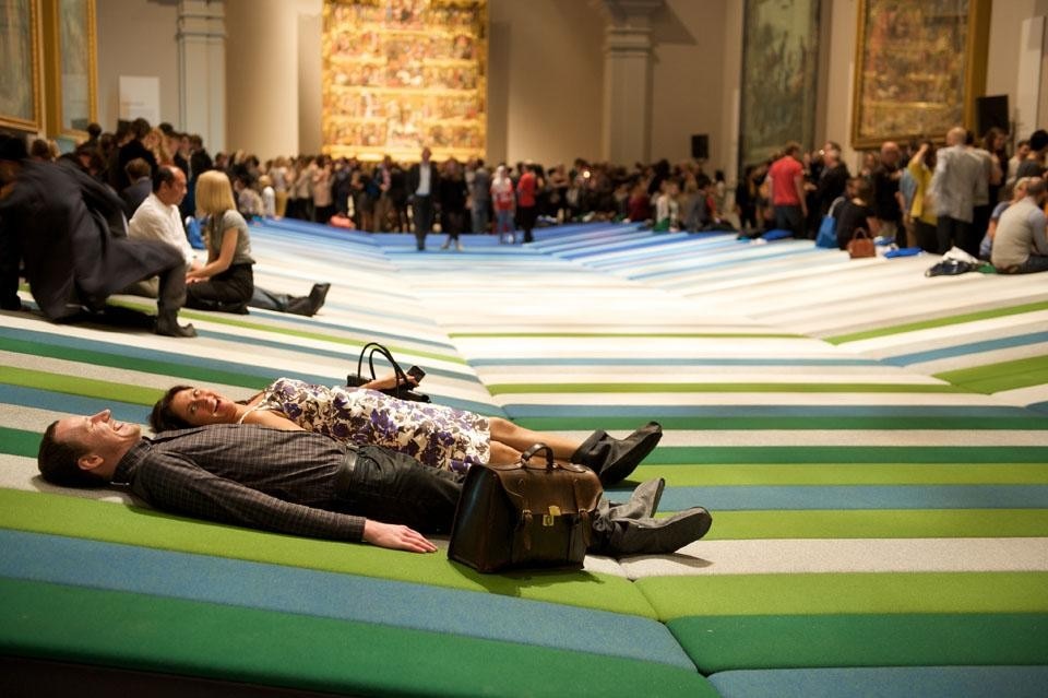 Esattamente quello che i due autori del progetto speravano succedesse. Ronan Bouroullec ci confida infatti, senza vergogna, di non amare i musei e di aver reagito con un iniziale senso di disagio alla proposta di Anders Byriel, CEO di Kvadrat, che chiedeva allo studio di pensare a un'installazione al V&A durante lo scorso London Design Festival (per la quale è stata peraltro necessaria l'autorizzazione della Regina, essendo il museo di proprietà della Corte). "Abbiamo visitato le sale del V&A e ho riflettuto sul perché non amo i musei: perché sono totalmente disconnessi dalla vita, sono luoghi morti, molto lontani dalla pratica del design. Mi piacciono le cose quando sono in relazione con la sensualità, con la vita. Così abbiamo pensato che un modo per rendere interessante un progetto in questo luogo fosse una ricerca su come le persone interagiscono con le opere d'arte esposte. E, a ben vedere, troppo spesso i musei si trasformano in una sorta di punizione. La sfida è stata quella di inventare o definire qualcosa che mettesse le persone in una situazione diversa, cioè ragionare come nel progetto di un arredo: se è ben riuscito da un punto di vista dell'ergonomia, se è confortevole, mette l'utente a suo agio, anche mentalmente. Abbiamo cominciato a immaginare in questa grande sala una piscina, poi una spiaggia di sabbia dove sdraiarsi per ammirare un paesaggio", spiega Ronan.