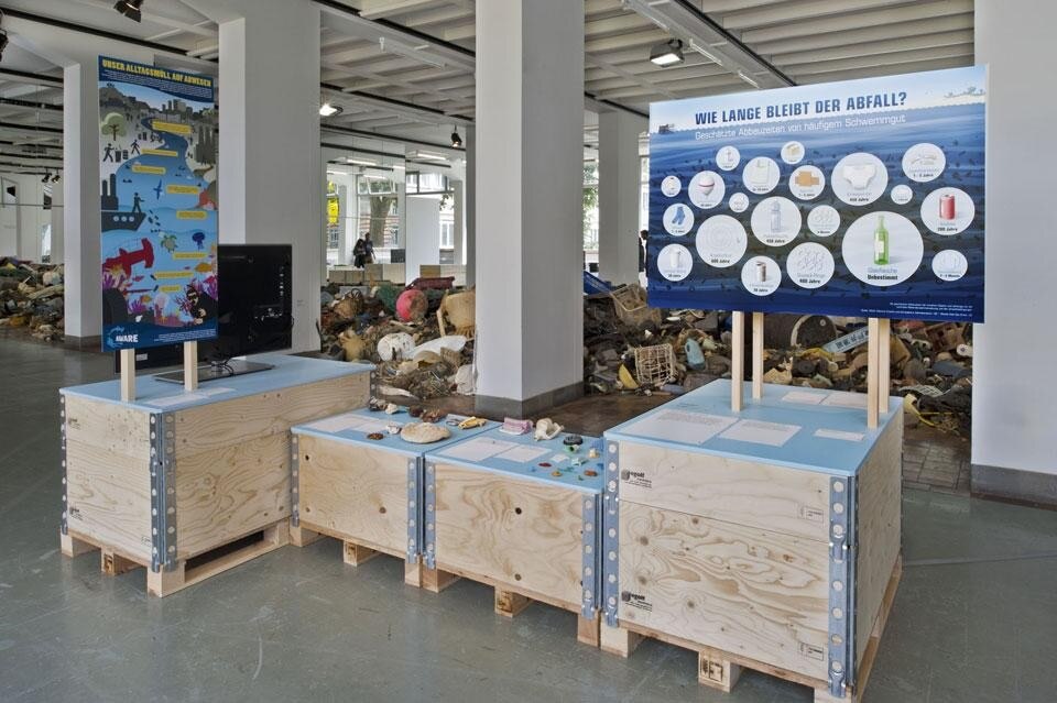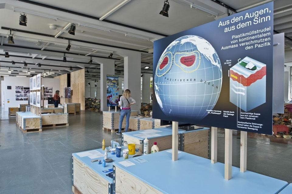 Mostra <i>Out to Sea? The Plastic Garbage Project</i>, in primo piano: pannello informativo <i>Plastic garbage in the sea</i>, Museum für Gestaltung Zürich, fino al 23 settembre 2012. Photo © ZHdK