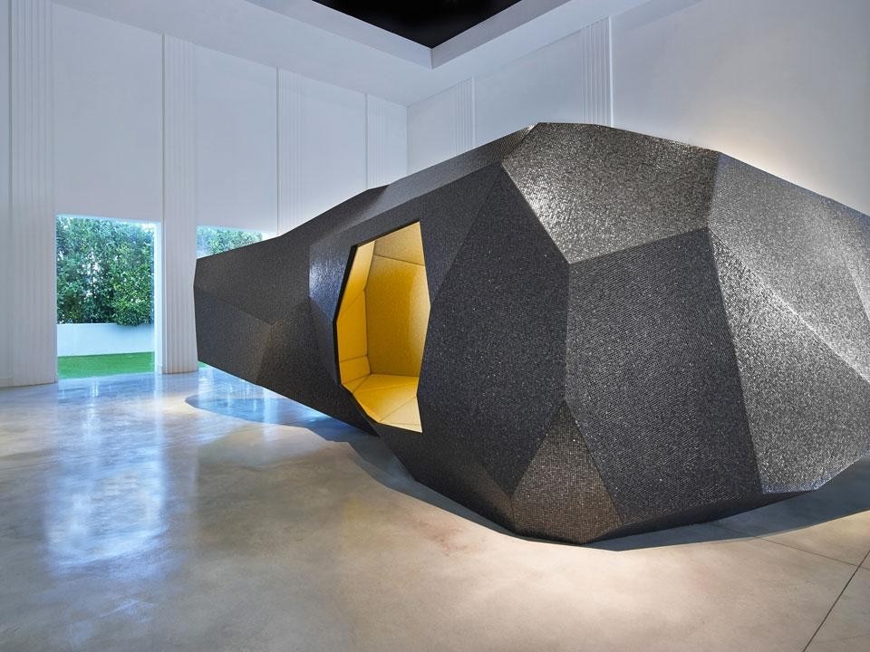 La somiglianza tra il volume e un geode – rivestito com'è di scintillanti, minute tessere di mosaico nero Bisazza punteggiato di scaglie metalliche – è completa quando ci si trova di fronte al suo interno: un cratere cavo che Levy chiama la "caverna", rivestito interamente di tessuto Kvadrat verde acido e illuminato da una delle lampade Fractal dello stesso designer. I pochi fortunati cui sarà consentito entrarci scopriranno uno spazio acusticamente isolato, caldo e confortevole dove l'esterno è completamente tacitato. "Siamo i primitivi del futuro", afferma Arik Levy, sottolineando che, negli anni a venire, il nostro ambiente immediato sarà "coperto dalle sabbie del Sahara", e le civiltà future si chiederanno come eravamo e come vivevamo. "È la caverna del nostro futuro", osserva infine.