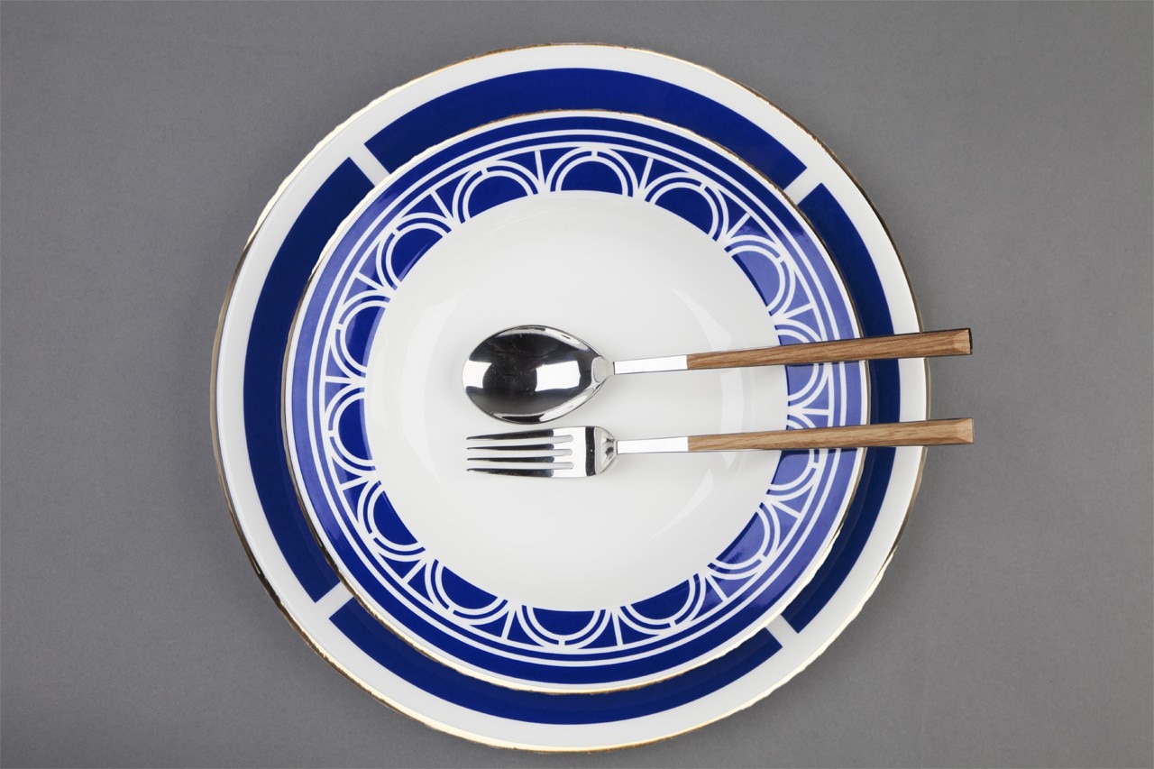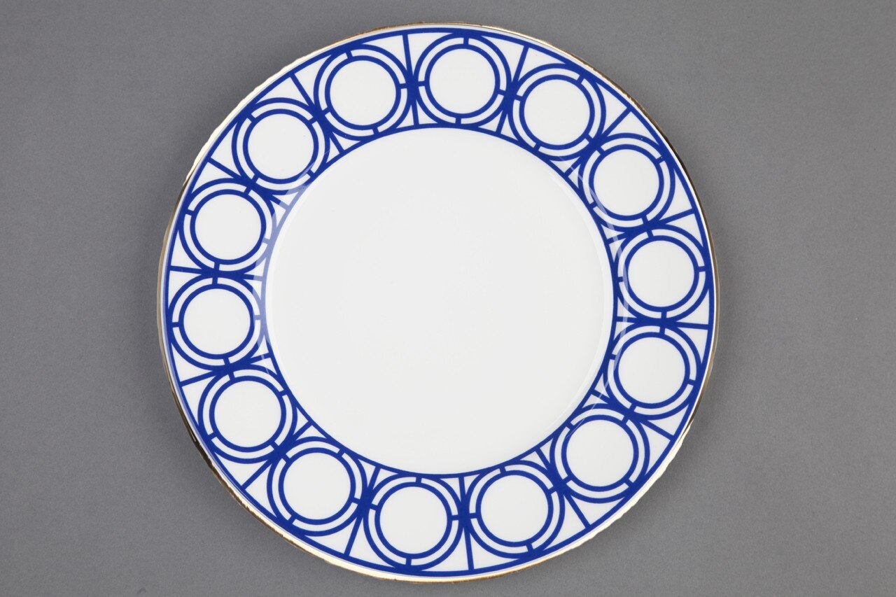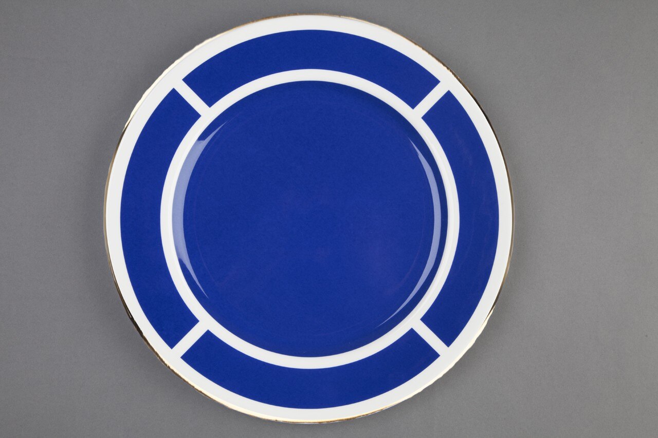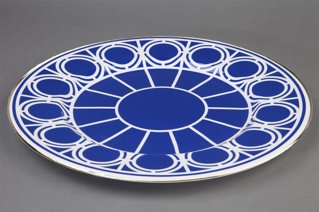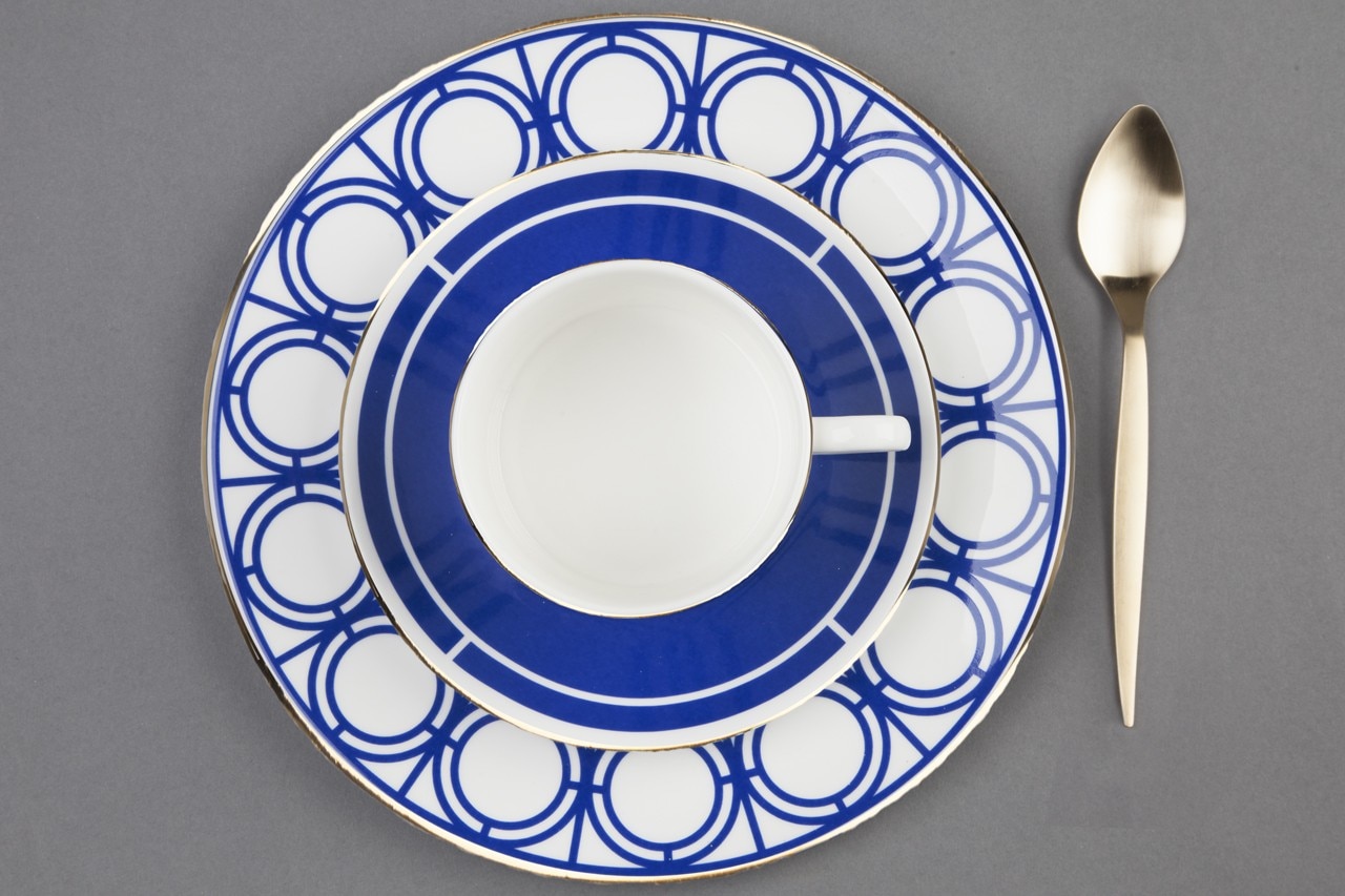 L’esplorazione grafica è sostenuta da una raffinata palette cromatica, con il blu reale inglese che contrasta con il bianco e l’oro. La collezione è interamente realizzata in Gran Bretagna, le carte da parati usano carta certificata FSC e le finiture metalliche sono realizzate a mano nello studio londinese di Custhom. Le ceramiche sono state prodotte a Stroke-on-Trent con porcellana inglese e ogni pezzo ha una bordatura dipinta a mano in oro 22 carati.