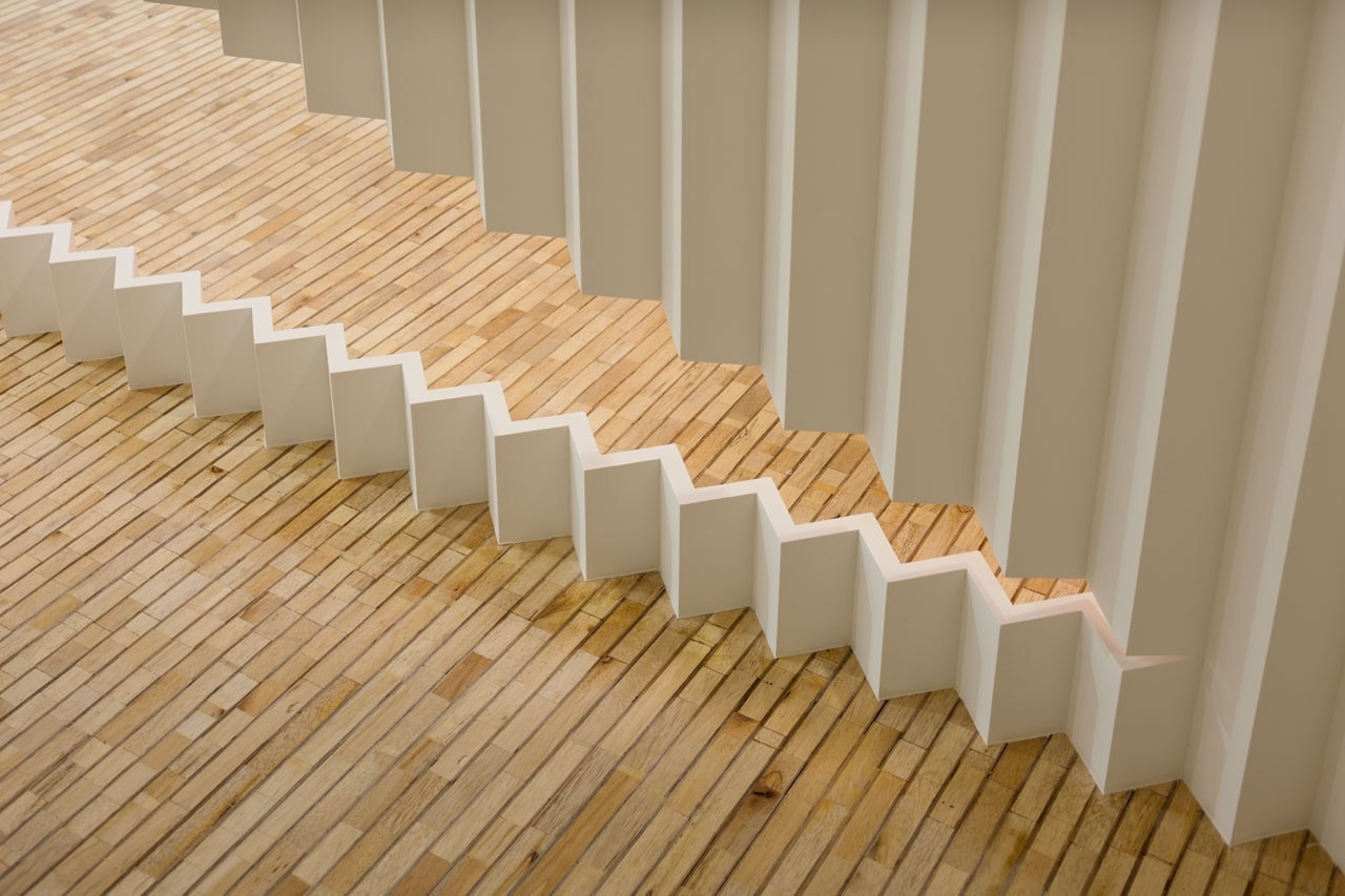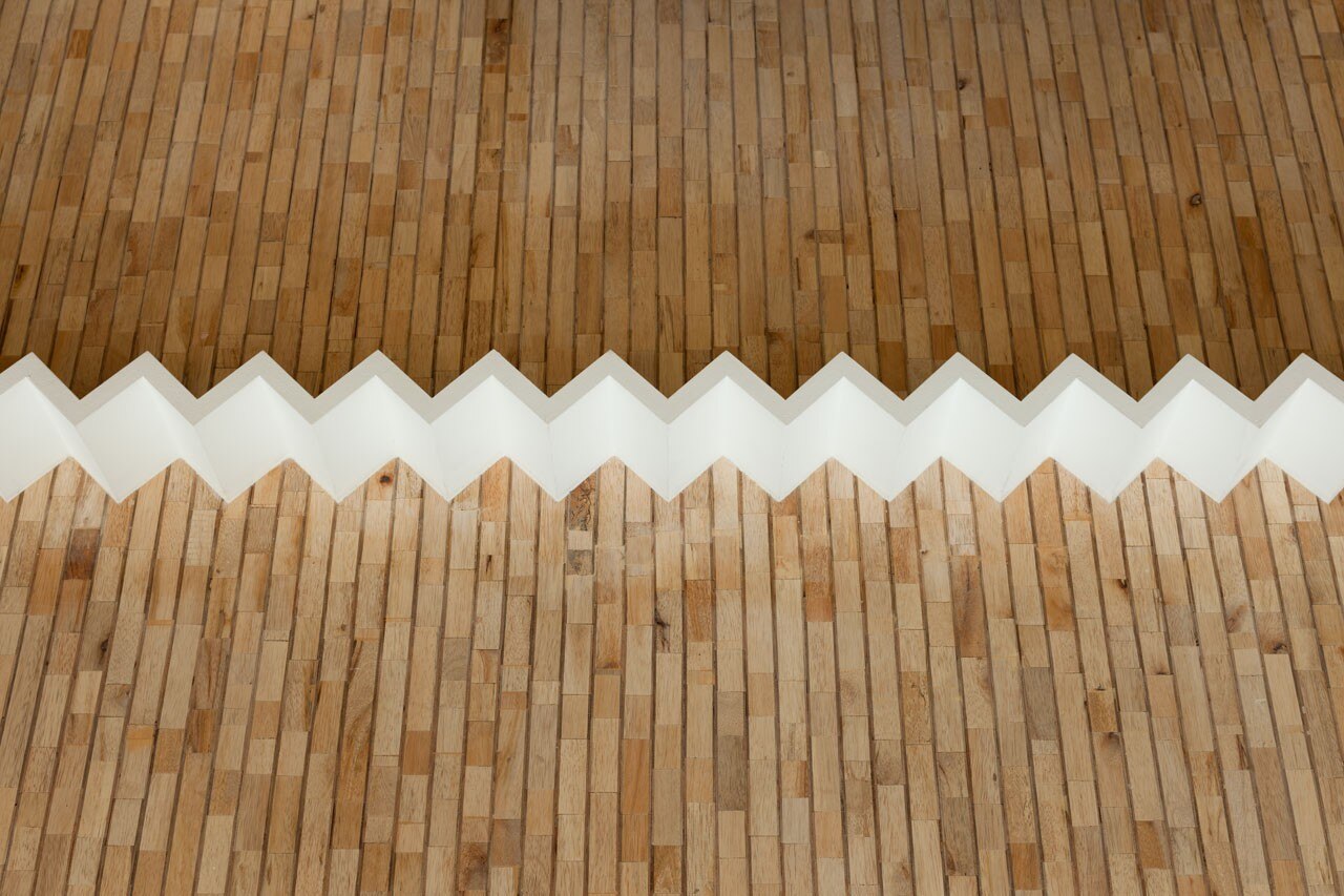 La parete a zigzag e la rifrazione della luce che ne consegue imitano i riflessi cangianti dello smalto, mentre le gradazioni cromatiche appaiono come i diversi livelli di intensità dovuti all’applicazione di strati successivi di smalto.