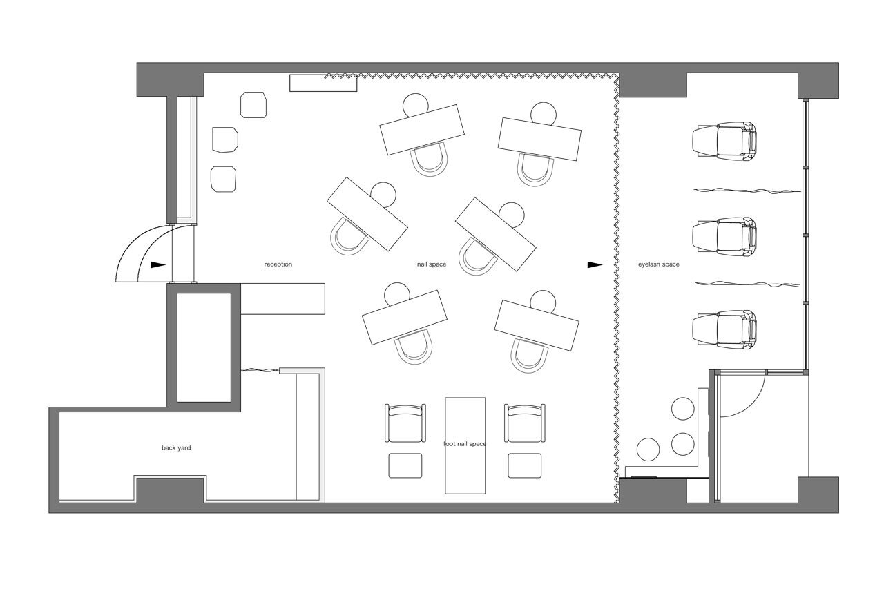 Le cromie, giocate sui toni del legno naturale e del bianco, intendono rappresentare i colori della pelle, mentre lo spazio è una rappresentazione simbolica della pittura delle unghie.