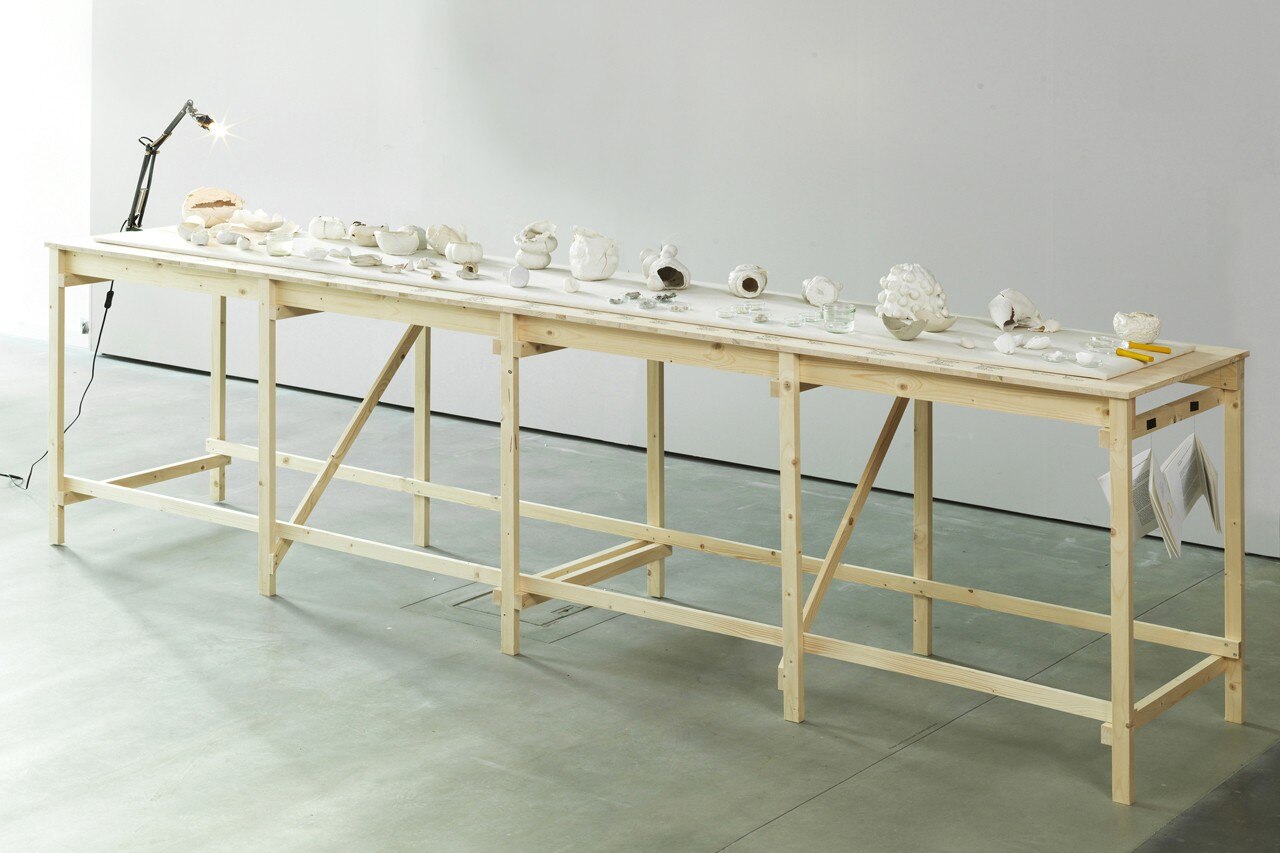 Simile alla crescita di un uovo, in cui il calcio si attacca alla membrana, la porcellana scivolosa (argilla diluita, che tende ad avere una consistenza liscia) è avvolta attorno a un dispositivo che servirà come quadro di ogni realizzazione. Descritta come “pneu”, il perno della macchina è circondato di alginato, un ingrediente gommoso. Questa sostanza, che normalmente si trova nelle alghe, attira l’umidità della porcellana, permettendo l’adesione dei minerali alla macchina. Come per la produzione di uova, questo garantisce la sovrapposizione di strati sottili generati dal movimento rotante del meccanismo.