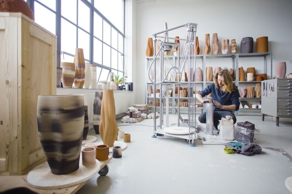 L’olandese Olivier Van Herpt realizza la collezione di vasi Sediment per la galleria Vivid di Rotterdam, specializzata nell’art design contemporaneo di matrice olandese. Van Herpt porta al limite le tecniche della stampa additiva con materiali ceramici, molto difficile da lavorare in pezzi di grandi dimensioni per il peso dell’argilla bagnata. La collezione cerca un’estetica a metà tra l’artificiale e il naturale, il fatto a macchina e il fatto dalla Natura. I tre vasi presentano differenti superfici tridimensionali che vanno da un pattern quasi frattale a uno completamente organico. Laureato della Design Academy Eindhoven nel 2015, Olivier Van Herpt ha già presentato questa collezione al Cooper Hewitt di New York oltre che nei principali musei olandesi.
