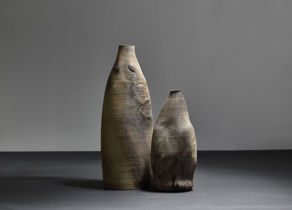 Sembrano di legno fossile i vasi scultura realizzati dal tedesco Ernst Gamperl per la galleria Sara Myerscough di Londra. Da due decenni, Gamperl studia il processo di essiccatura del legno, cercando di governarlo per realizzare forme scultoree. Le curve e rientranze, le dentellature e fratture nel legno, così come la texture superficiale provengono da un processo di deformazione controllata della materia. Anche il trattamento della superficie, a mezzo di particolari sabbiature e ceratura, sono volte alla ricerca di una “naturale bellezza”, ottenuta attraverso una complessa manipolazione.