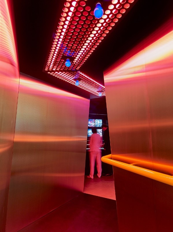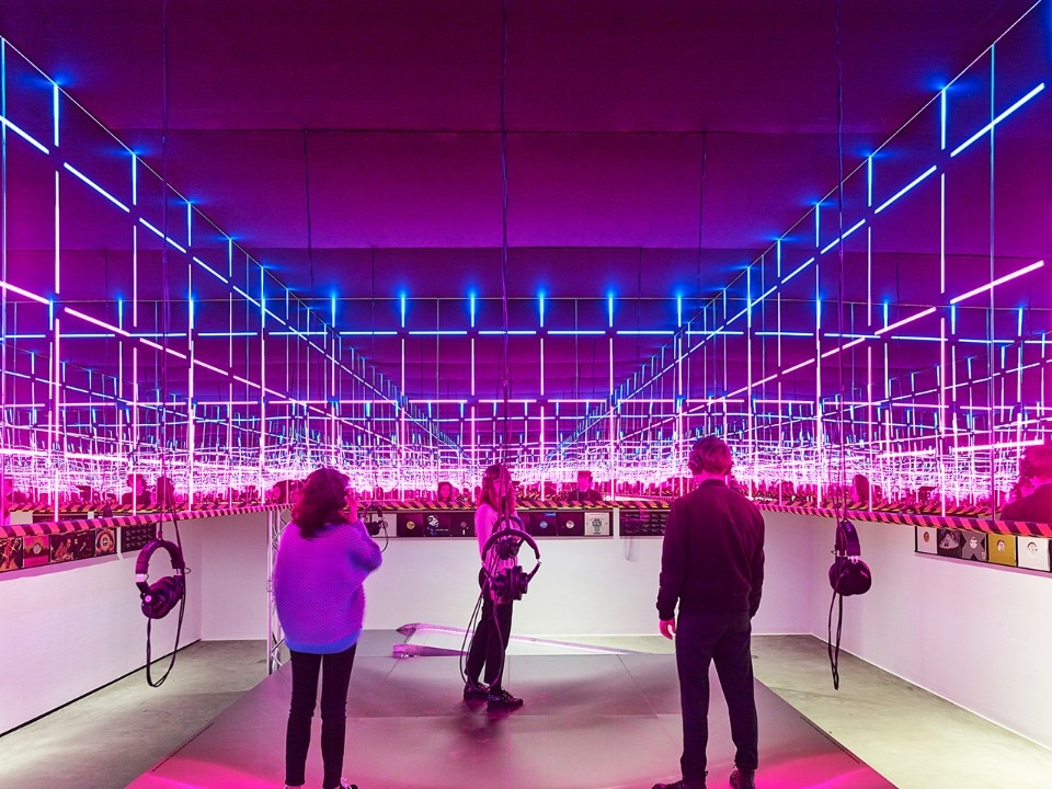 Si passano gli anni Sessanta e si prosegue con New York degli anni Settanta-Ottanta: sono questi anni di emancipazione del mondo Lgbt, laddove si stabilisce che le serate gay debbano avere della bella musica. L’Ice Palace Fire Island, Paradise Garage Logo, Le Jardin. Una sala della mostra è dedicata all’ascolto dei vari generi di musica che furono i protagonisti della club culture. In una sorta di silence disco con varie postazioni cuffie, dal recinto rettangolare e l’ambiente specchiato, ogni postazione si fa portavoce del racconto musicale: dalla disco alla techno e alla house. La mostra è didascalica e contiene foto, informazioni e ritrovati. Fondono discoteca e arte il Mudd Club (1978) o l’Area di New York che offrivano nuove opportunità ai giovani artisti emergenti, qui ebbero inizio le carriere di Keith Haring e Jean-Michel Basquiat. Si prosegue e non manca la sensazione di spazio alterato e Isozaki se ne fa portavoce: prima noto come architetto metabolista, si staccò molto presto dal movimento, sentendosi più vicino ai giapponesi Dadaisti, lavorando però col milieu rifiutato, ovvero con Kenzo –Tange (metabolista).