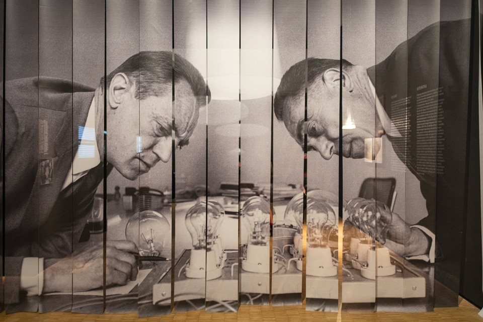 E proprio Patricia Urquiola – che è stata allieva di Castiglioni al Politecnico – allestisce una mostra densa di materiali e progetti, ma sempre leggerissima e sempre divertente, in un dialogo perfetto con il Maestro. Stessa eredità progettuale, stessa ironia. Un dialogo che trova un sorprendente e immaginifico punto d’incontro nell’installazione TraParentesi: come 100 candeline di compleanno, i 100 modelli della lampada Parentesi s’illuminano e creano una foresta di sensazioni sonore – i movimenti dei visitatori che attraversano lo spazio attivano sensori che riproducono ora suoni di materiali, ora la voce stessa di Achille che racconta. A ricordarci che un materiale si riconosce e si definisce anche dal suono che emette toccandolo e picchiettandolo, da come risuona quando cade o si rompe. Al buio di questa sala, c’è una sintesi profonda di Castiglioni, quel “sapersi prendere in giro come faceva Jacques Tati”: non prendersi troppo sul serio, anche se si lavora seriamente.