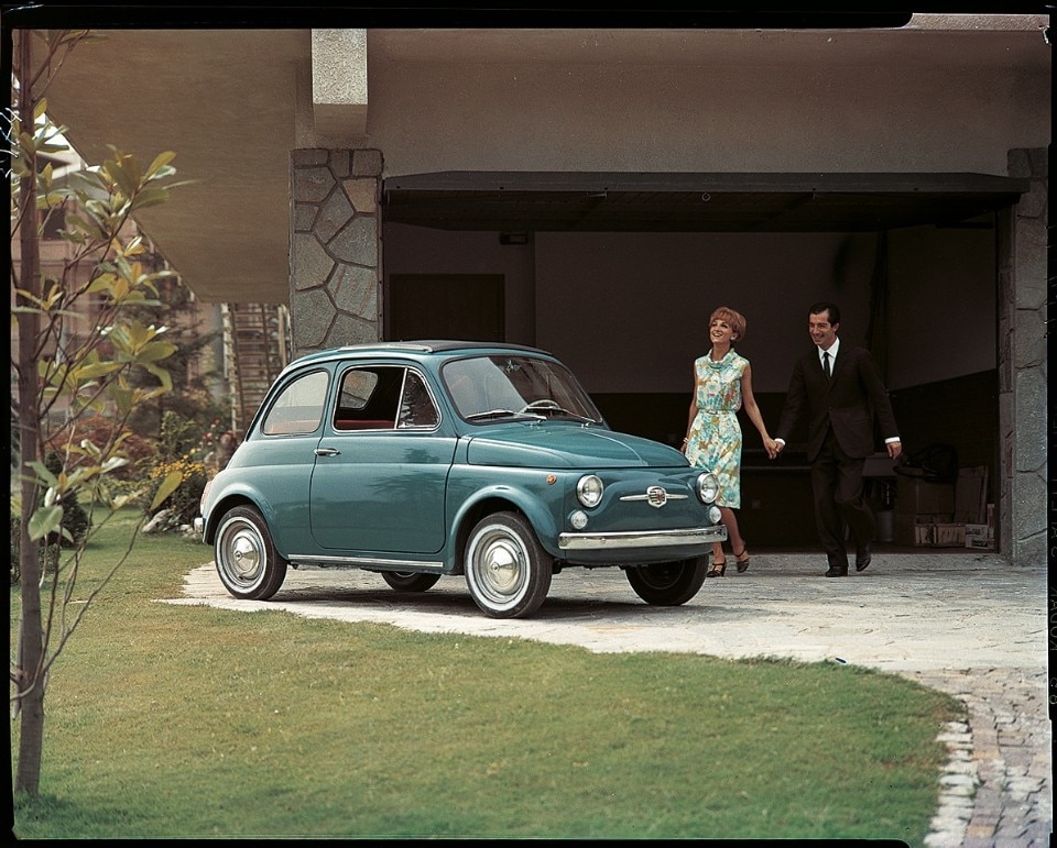 Mentre Laika vola nello spazio (e Carosello va a gonfie vele), sulla Terra nasce la Nuova 500. Il responsabile del progetto è Dante Giacosa, già autore della Topolino e della Nuova Balilla e che poi realizzerà Campagnola, Bianchina, 127 e 126. Lo schema è quello della Topolino, quel “tutto dietro” con motore posteriore, ruota di scorta davanti e un piccolo vano non imbottito per i bagagli dietro ai sedili. Che all'inizio sono solo due, troppo pochi per motorizzare un'Italia in cui la famiglia è ancora centrale e i bambini fioriscono anche come risposta alla guerra. L'estetica che ci affascina ancora oggi è dovuta a una semplice equazione: l'auto è lunga 2,97 m ma è larga e alta 1,32. Praticamente un cubetto tutto smussato con un muso bene in evidenza. Ha il tetto apribile, il peso a vuoto è 470 Kg, quasi un terzo di una Smart odierna, la velocità di 85 km/h. Il prezzo però è alto: 490mila lire. Un anno di stipendio, troppo. Con centomila lire in più infatti si può prendere una 600, l'altra icona del boom economico italiano, che è uscita nel '55, ha quattro posti e due portabagagli.