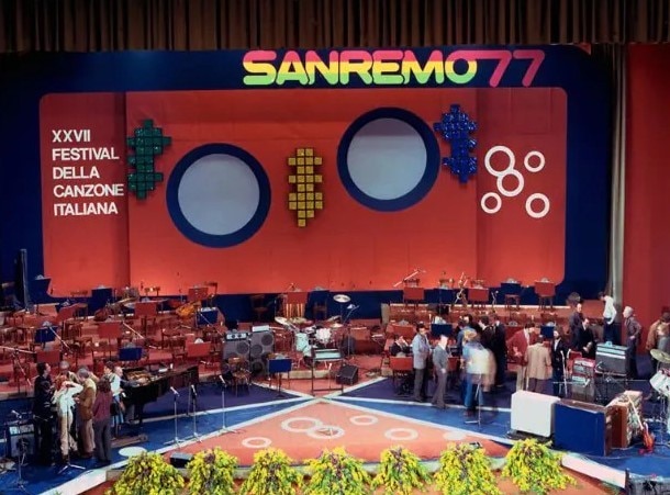 Bisognerà aspettare l’avvento della TV a colori nel febbraio 1977 e, soprattutto, il passaggio al palco del Teatro Ariston per ritrovare nelle scenografie del festival quello slancio cromatico e progettuale che sino ad allora aveva invece avuto libero sfogo in discoteche, interni abitativi, sale giochi e varietà televisivi.