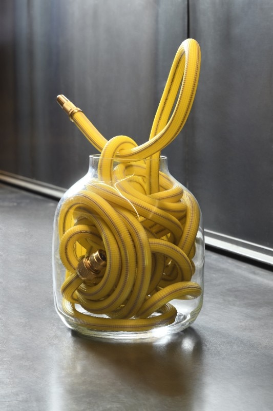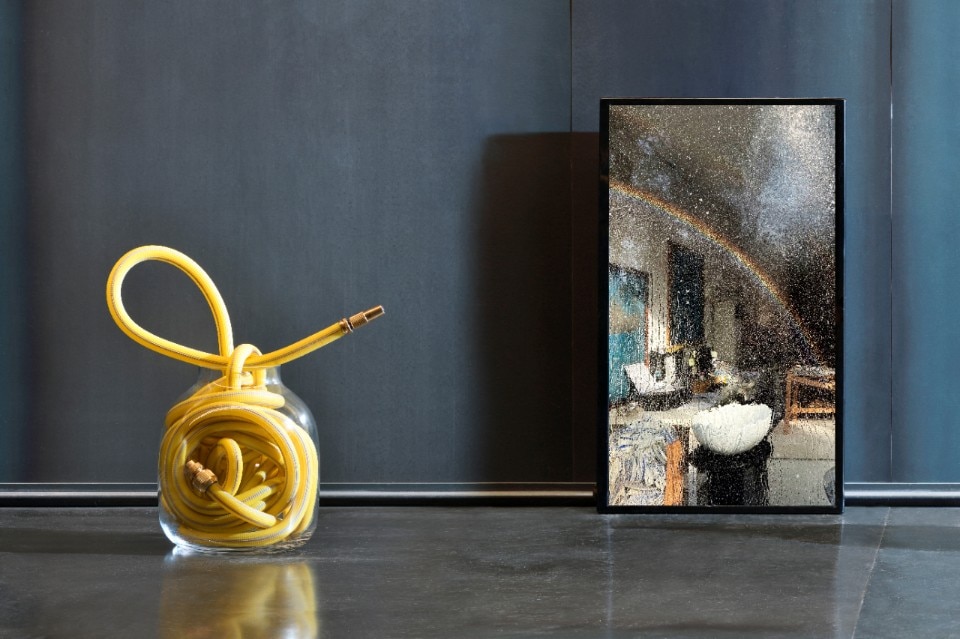L’arcobaleno che così si genera interagisce visivamente con l’ambiente dello studio attraverso il filtro della vetrata su cui si riflettono gli alberi, dove esterno e interno si fondono e si sovraimprimono, mentre fanno capolino oltre il vetro anche alcuni dei pezzi più importanti disegnati in passato da Damiani. Ma l’azione poetica del creare arcobaleni – azione segnata da una voluta impermanenza e istantaneità – è raccontata, in mostra, anche da una presenza concreta e più duratura: un vaso trasparente ospita un lungo tubo in gomma per spruzzare acqua, sollecitando l’osservatore a sperimentare la “progettazione” di un arcobaleno, magari – scrive Damiani – “insieme ai propri bambini”.
