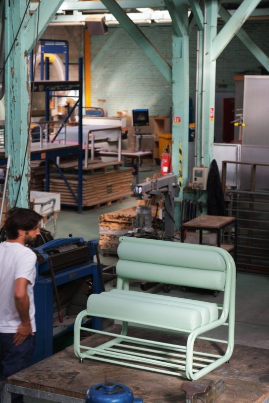Con un processo che ibrida lavorazioni artigianali e industriali, nello stabilimento di Ivry-sur-Seine prendono forma i pezzi di una collezione di mobili, tutti fortemente caratterizzati dai tratti estetici dei semilavorati, spesso coloratissimi e dal costo accessibile.