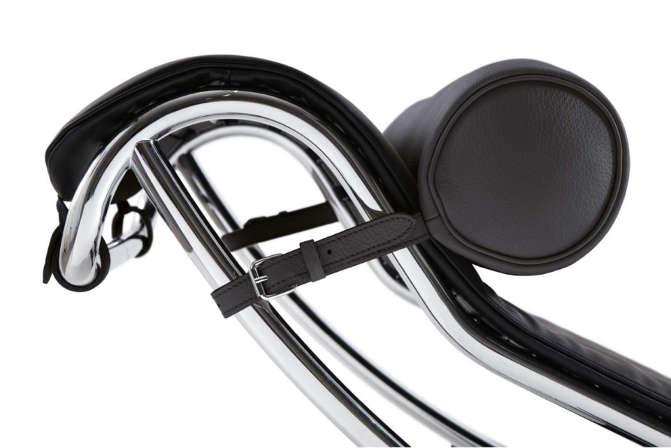 La vera invenzione sta altrove: nella struttura sdoppiata, dove il lettino scorre liberamente sulla base; nei due tubi curvi che modellano la traiettoria ergonomica del corpo; nelle guaine di gomma che impediscono lo slittamento e trasformano la meccanica in comfort percepito; nella possibilità di variare l’inclinazione in modo continuo, senza scatti, quasi fosse un respiro; nell’evocazione aeronautica della base, con le sue sezioni a goccia che citano le ali degli aerei.