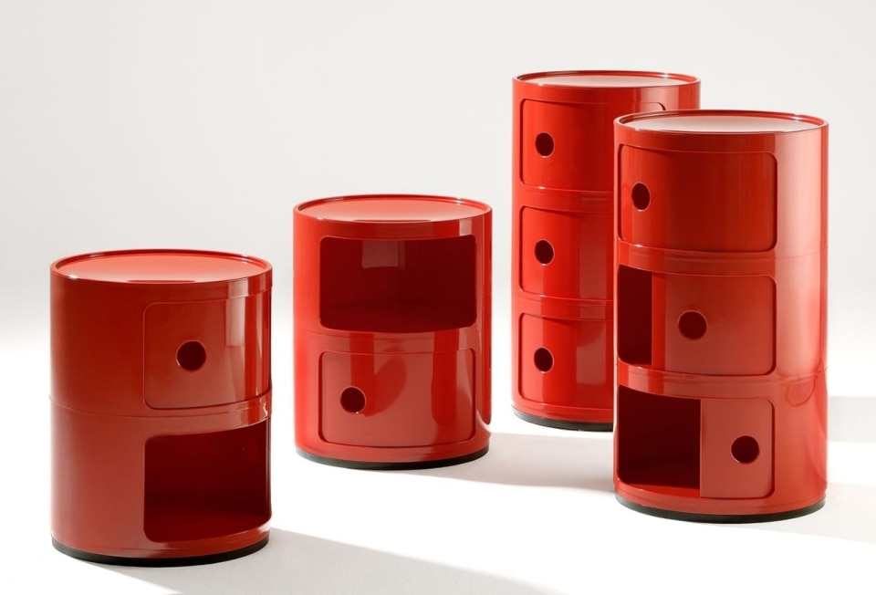 Espressione dell’ingegno che ha reso il design italiano celebre nel mondo, i componibili sono il prodotto più riconoscibile dell’azienda di cui Anna Castelli Ferrieri fu fondatrice insieme al marito Giulio Castelli. Coloratissimi e, ovviamente, in plastica sono pensati per incastrarsi l’uno con l’altro in altezza, per formare una torre di cassetti potenzialmente infinita.