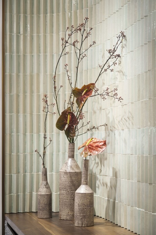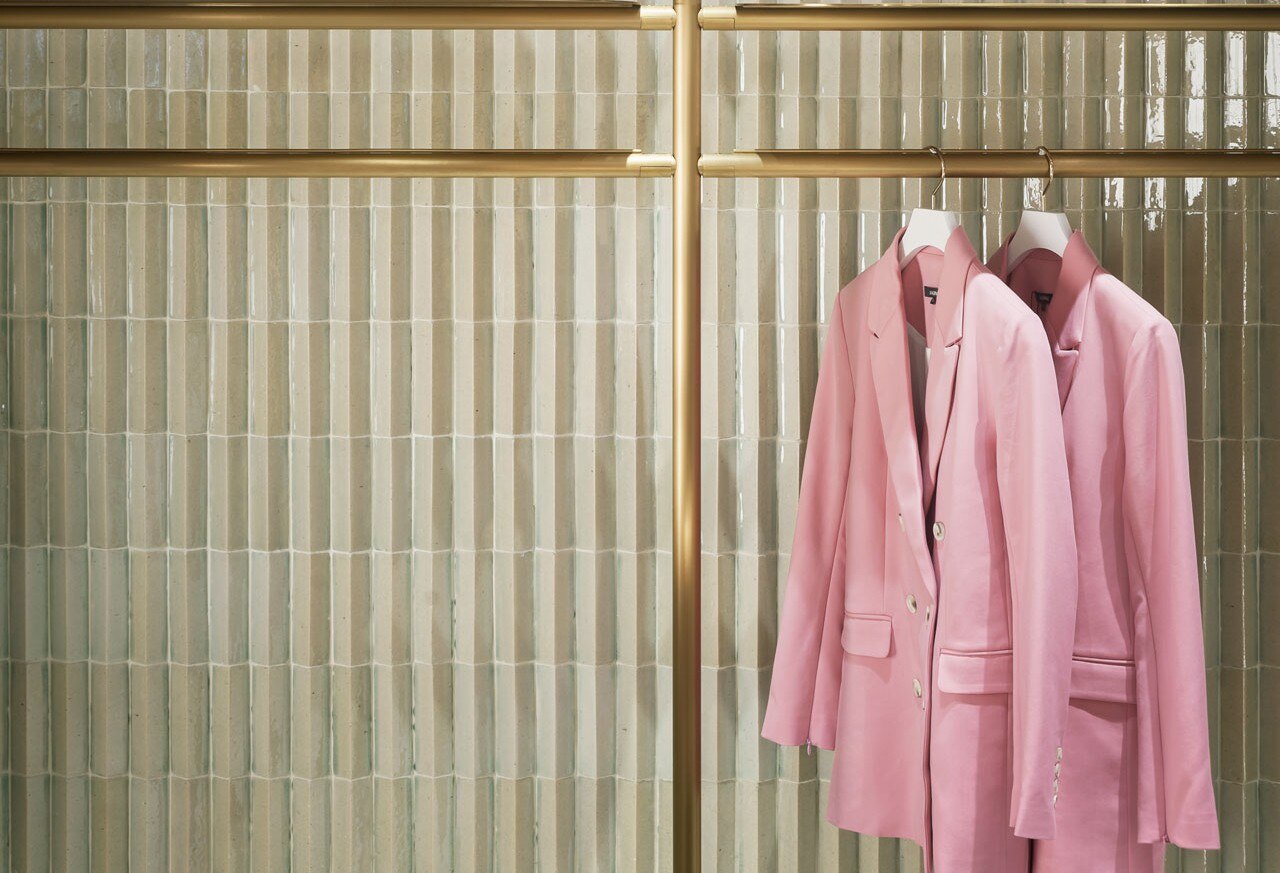 Il nuovo negozio Jaspal firmato Studiopepe è abbracciato da una morbida parete in ceramica smaltata locale realizzata con una tecnica artigianale locale nei toni del bianco latte, rosa e verde celadon. Lo spazio è definito da materiali contrastanti come le fibre naturali e il cemento, il tutto spolverato da una nuvola di cipria rosa.