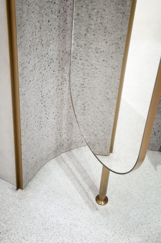 Le mensole geometriche e le cornici dei separé semicircolari per i camerini sono realizzate in legno naturale scuro per dare un senso complessivo di accoglienza.