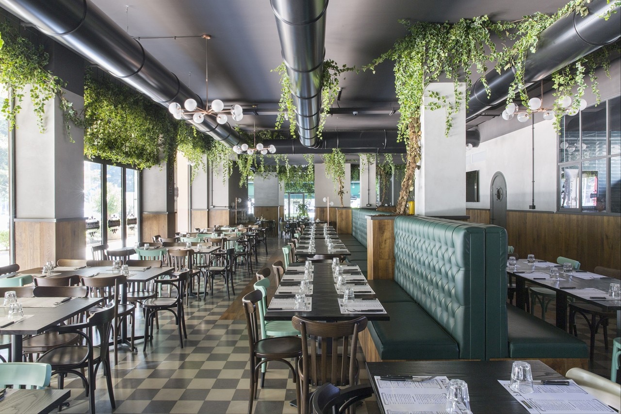 Antica Birreria Heineken combina gli elementi tipici del gastro pub – legno e sedute imbottite – con dettagli spiccatamente industriali, come gli impianti a vista sul soffitto nero e il profilo di ferro che corre sul bordo superiore della boiserie in legno di rovere anticato.