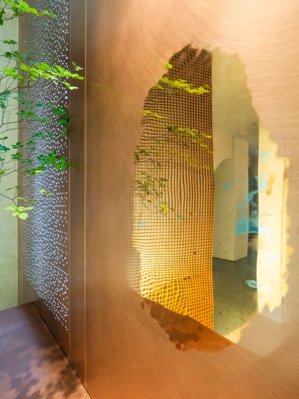Nei bagni, una lastra di rame lucidata all'altezza del viso rispecchia inaspettatamente i visitatori.