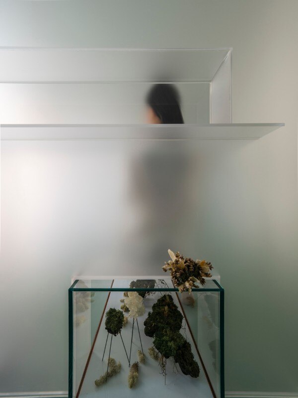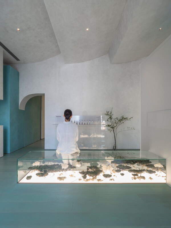 Schermi blu mare, piante e minerali tradizionali della medicina cinese posizionati staticamente in teche di vetro luminose ricreano la scena delle sale, stimolando la visione e l'immaginazione del cliente.