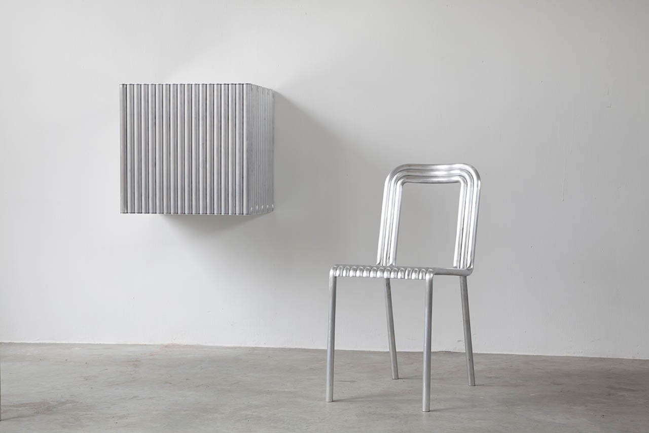 Le qualità di un materiale, l’alluminio, e le potenzialità scaturite dalla sua applicazione in chiave modulare sono i presupposti che ispirano la collezione Alltubes, presentata dai designer belgi Muller Van Severen a Collectible Design Fair a Bruxelles. Come il nome stesso suggerisce, tubi di alluminio sia dritti che piegati sono utilizzati per dare vita a due cabinet, di cui uno sospeso a parete, insieme ad una sedia e una panca.