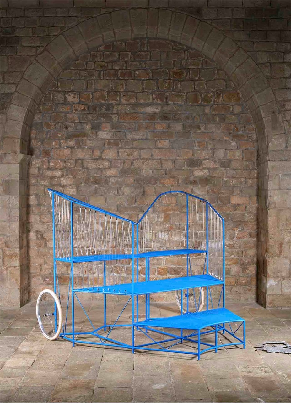 Concepita come uno spalto mobile da trasportare di fronte alle diverse opere a seconda delle esigenze dei singoli eventi, Exedra si compone di due strutture simmetriche da comporre ad anfiteatro, così da facilitare l’intimità tra i partecipanti. La forma a cuore della struttura in ferro è ispirata a tipologie d’arredo quali il divano vittoriano o la sedia Acapulco, mentre le dimensioni delle gradinate favoriscono una postura leggermente reclinata, invito ad una partecipazione informale e rilassata.