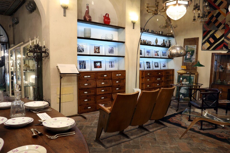 Si innesca un cortocircuito produttivo tra rappresentazione fotografica del magazzino, architettura storica del chiostro che la ospita, e arredi e oggetti con cui le fotografie sono poste in un dialogo talvolta stravagante. Si asseconda, così, lo straordinario eclettismo di questo negozio-spazio espositivo: è possibile passare da una credenza rinascimentale con cariatidi del ‘500 a un trono di Mario Ceroli della serie Mobili nella valle, dalla lampada umidificatore di Denis Santachiara alle poltrone cinema di Gastone Rinaldi, dalla Libreria Lips Vago a una consolle di Giovanni Michelucci, per giungere a oggetti rari o non in vendita come ombrellini futuristi, giocattoli e mobili da bambino appartenenti alla collezione privata di design per l’infanzia di Maurizio Marzadori. Una collezione innanzitutto di mobili da bambino per la casa e per la scuola, e poi di giochi, materiali didattici, riviste, complementi d’arredo e vestiti dalla fine dell’800 agli anni ‘70 del secolo scorso, che insieme disegnano la storia del design per l’infanzia e raccontano i mutamenti sociali, culturali e pedagogici di un secolo d’Italia.