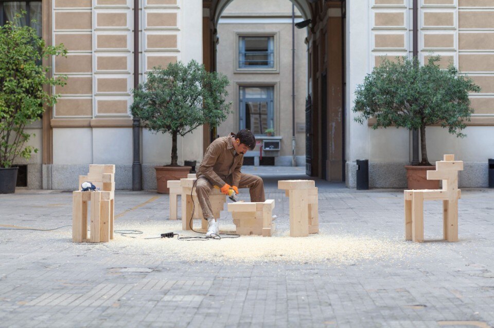 Al Fuorisalone 2021 Francesco Pace, alias Tellurico, ha presentato la performance Untitled 1B, ideale seguito di Untitled 1A (del 2020) ed entrambe commissionate da 5Vie Milano (e supportate dall’Ambasciata Olandese in Italia). Lo si poteva osservare nel cortile della SIAM (l’antica Società d’Incoraggiamento d’Arti e Mestieri, fondata nel 1838) mentre scolpiva blocchi di legno, dando forma a una serie di arredi. È un lavoro che riassume in pieno il suo approccio (che lui definisce multidisciplinare) e le recenti riflessioni emerse anche durante il lockdown. È performance e narrazione al tempo stesso, che parla del tempo e del lavoro del designer e dell’artigiano, del processo spesso nascosto dietro un bell’oggetto, e di sostenibilità. Tutti temi cari al designer originario di Pozzuoli (Napoli) che per avviare la sua carriera ha però scelto l’Olanda e che torna al Fuorisalone dal 2018, quando ha presentato il progetto per la Galleria Salvatore Lanteri, dove combinava la lava dei Campi Flegrei e la porcellana.