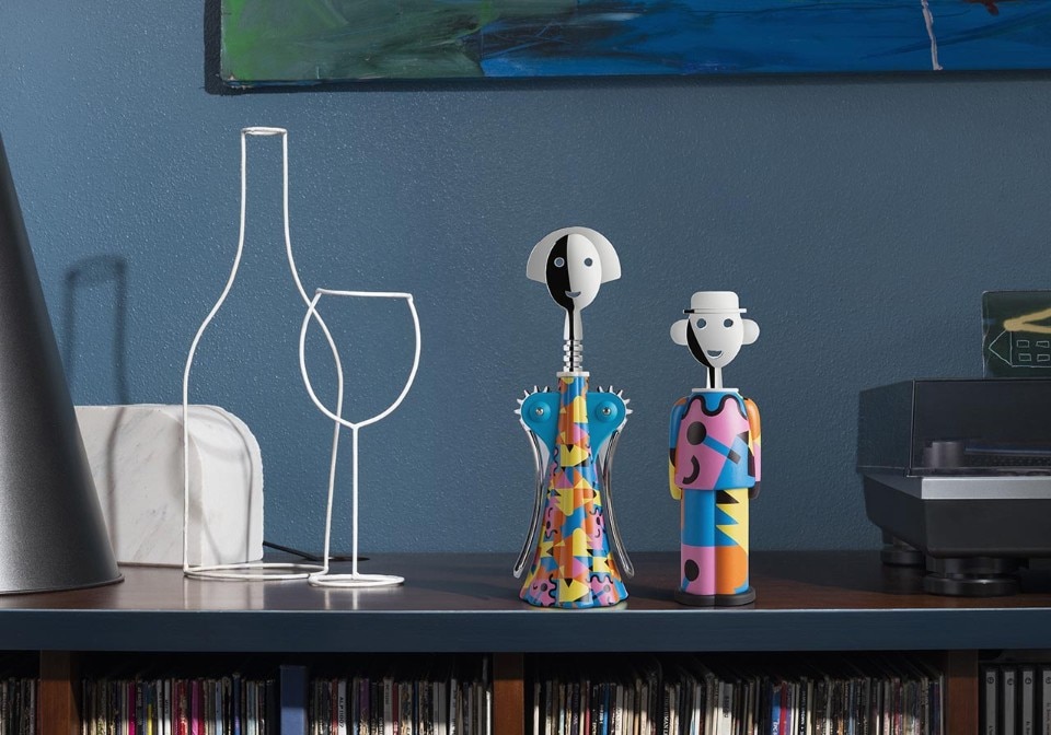 Questi celeberrimi cavatappi di Mendini, emblema della personificazione dei nostri utensili da tavola, cambiano d’abito per indossare il decoro Galla Placidia, disegnato da Mendini nel 1984. Anna G. e Alessandro M. incarnano così un inno all’ibridazione che accorcia le distanze sia con la moda che con i riferimenti alla cultura alta della nostra storia dell’arte.