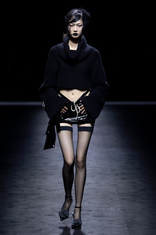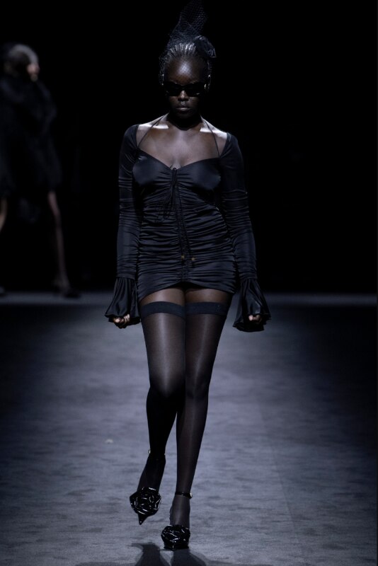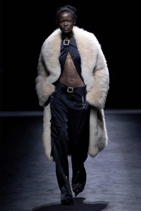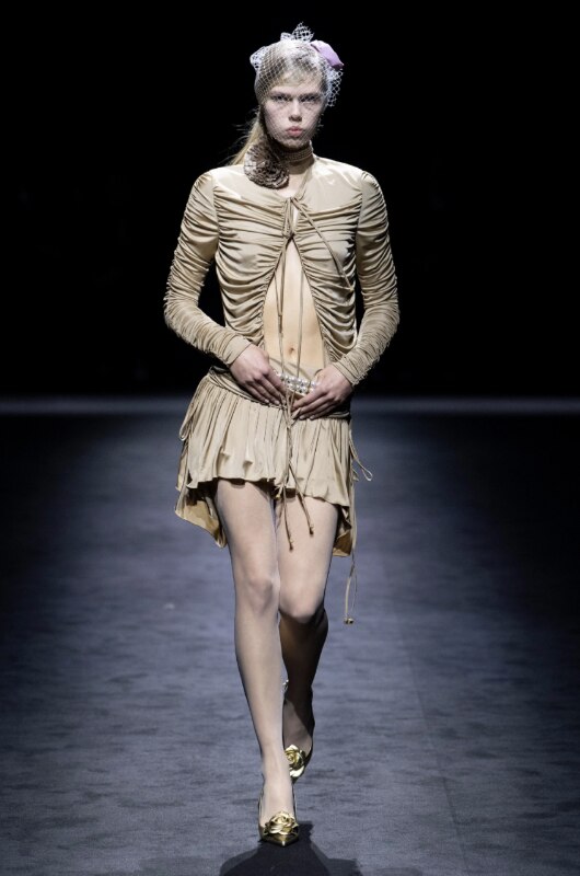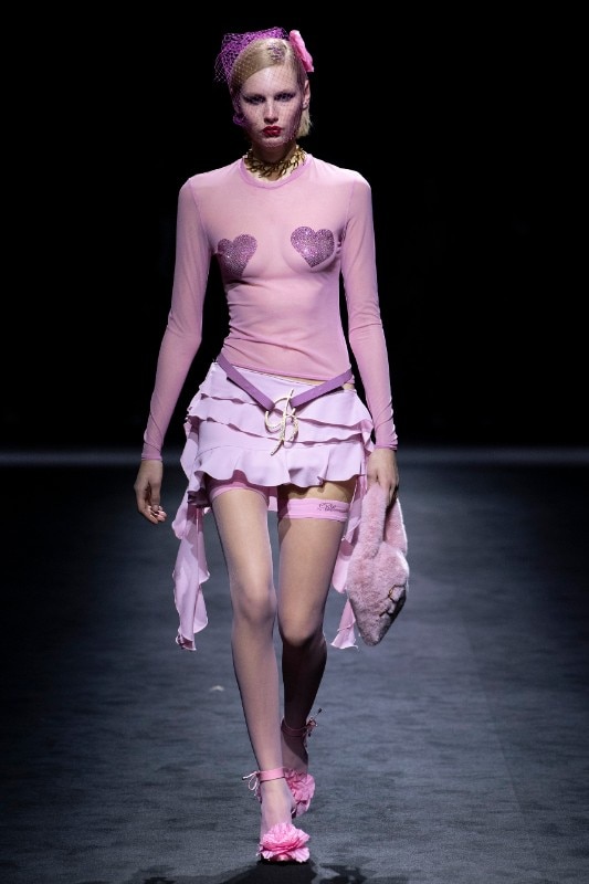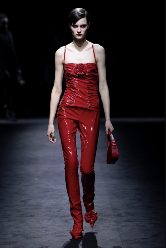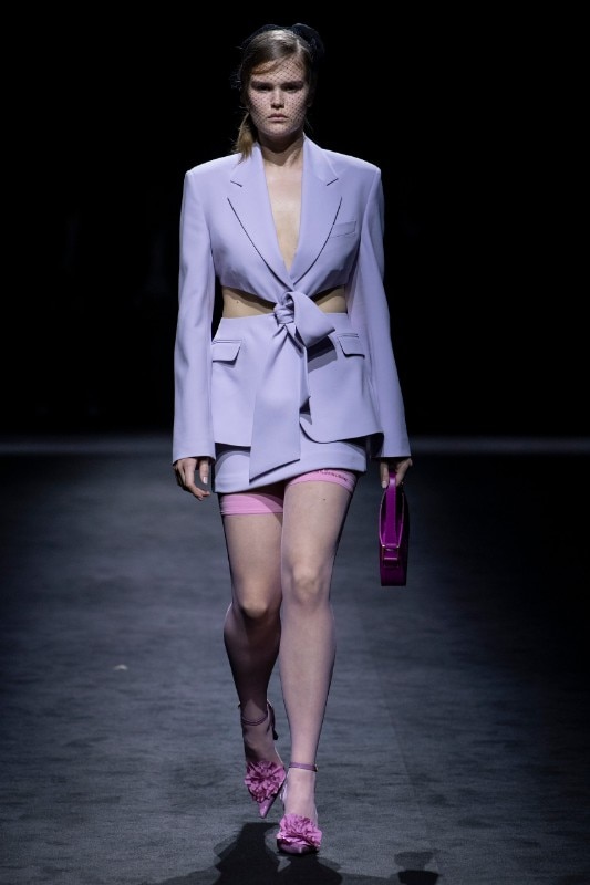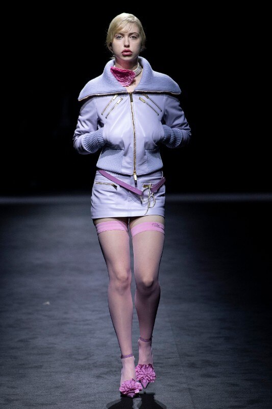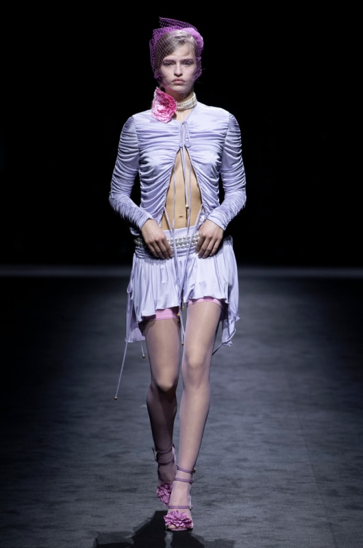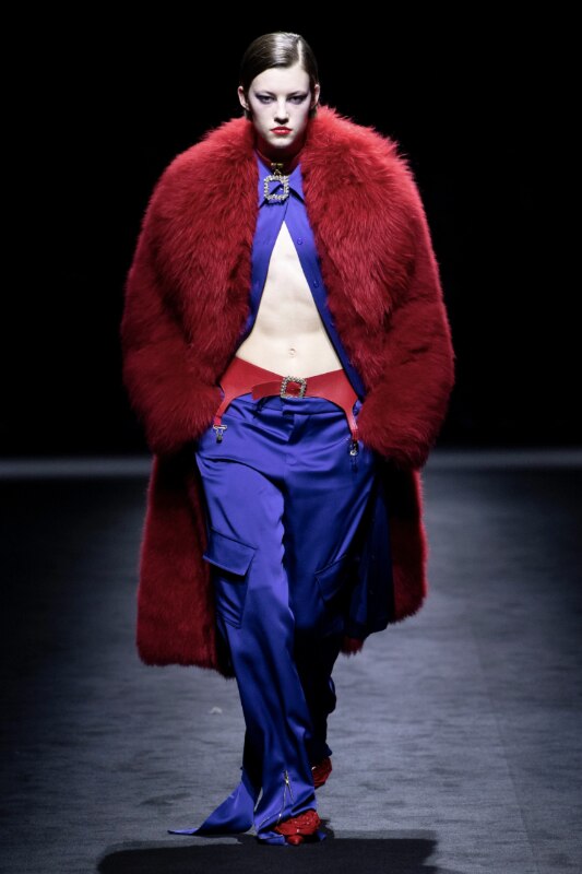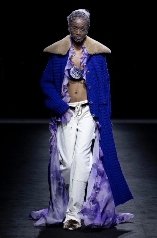 Altro momento atteso è stato il ritorno sulle passerelle di Blumarine, un revival degli anni Novanta con a capo Nicola Brognano, che dal 2019 è impegnato a riscrive i codici estetici del brand all’insegna di leggerezza e felicità. Una collezione che è un inno alla femminilità, i capi guardano alla scena musicale del pop femminile anni 2000 e al sex appeal glam e vistoso. Ma tutto viene riletto a uso e consumo della Generazione Z. Le tute sono accessoriate con fibbie di diamanti, i top a cascata incontravano le gonne a fazzoletto, e le camicie di raso con corsetteria incorporata erano indossate con jeans a gamba dritta e tacchi impreziositi da corsetti. “Cresciuta nella consapevolezza di sé, la donna Blumarine apre il suo mondo ad una sensualità senza compromessi, potente e libera dal preconcetto della fisicità, che porta ad una presa di coscienza che la seduzione è prima di tutto un’attitudine” spiega Brognano.