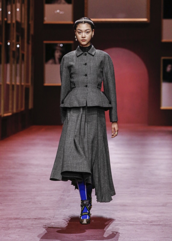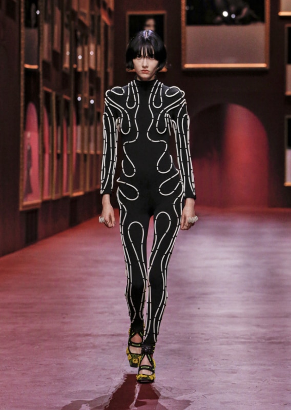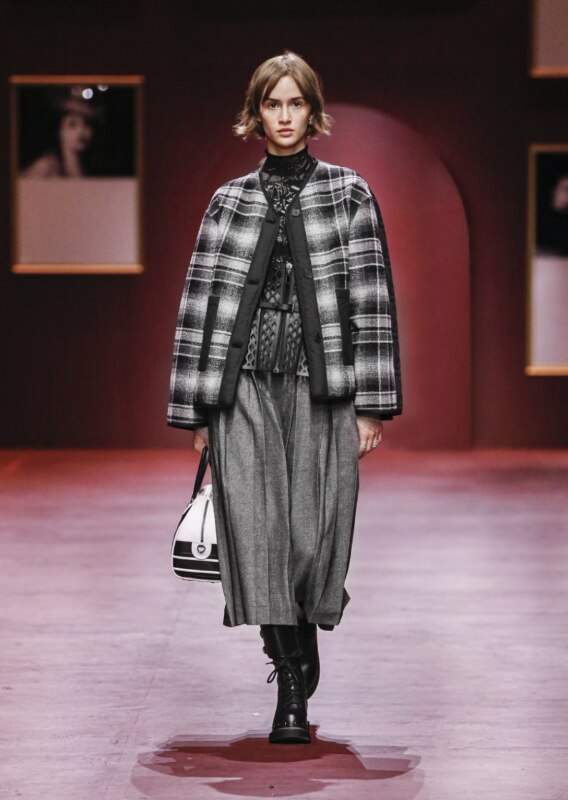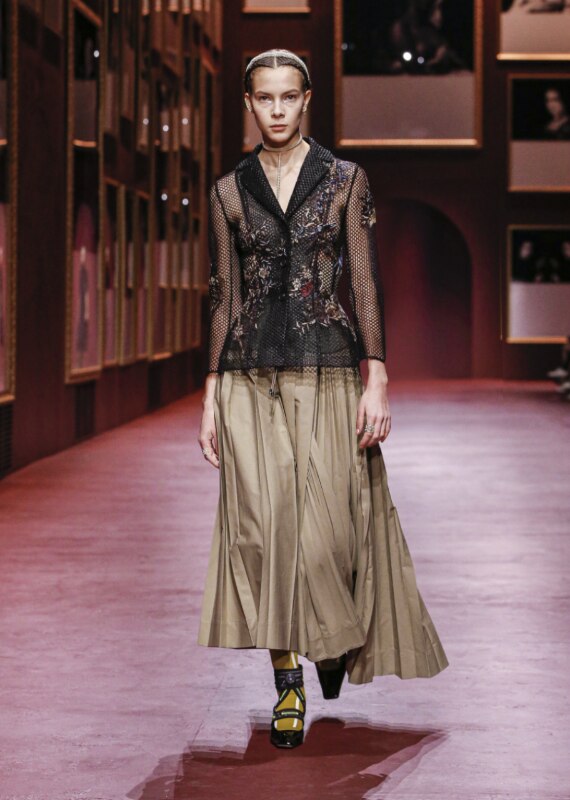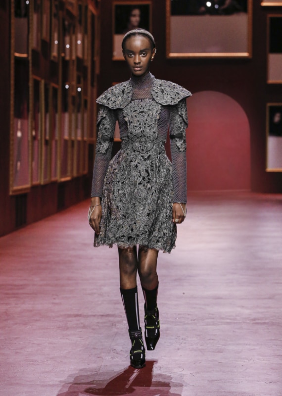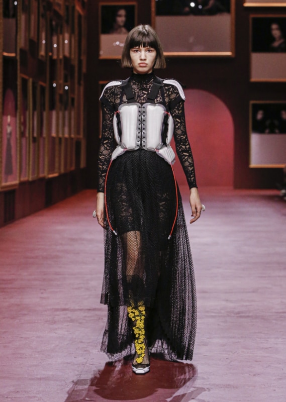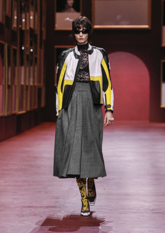 Disegnata da Bureau Betak, la collezione di Maria Grazia Chiuri sfila in una scenografia dettagliata da pareti foderate in velluto rosso e una serie di occhi fissi sul pubblico. Chiuri arruola spesso artiste donne nei propri lavori, trovandoci questa volta di fronte ai ritratti femminili dell’artista italiana Mariella Bettineschi. Le sue opere prendono ritratti femminili canonici dal XVI al XIX secolo – come la Ragazza col turbante di Jan Vermeer – e li reimmaginano con gli occhi tagliati e surrealmente duplicati. Per la prossima stagione, questo si è tradotto in silhouette forti, che hanno visto la Bar Jacket di Dior rielaborata e decostruita in corsetti ispirati dal football americano e stratificati su delicati abiti di pizzo e trench. Vividi guanti da motocross erano abbinati a mantelle, gonne voluminose e abiti camicia, giacche da ciclista e tute da lavoro erano giustapposte a stampe floreali femminili.