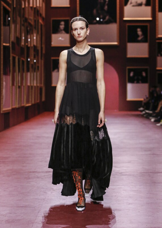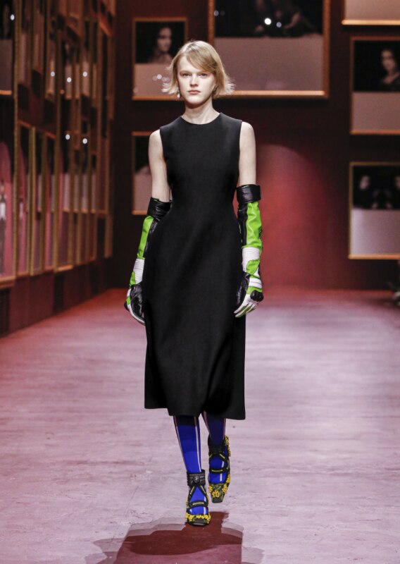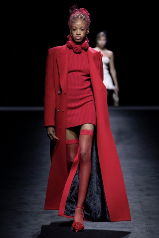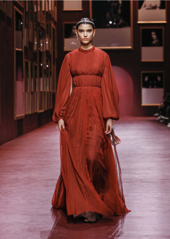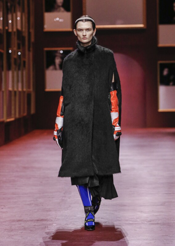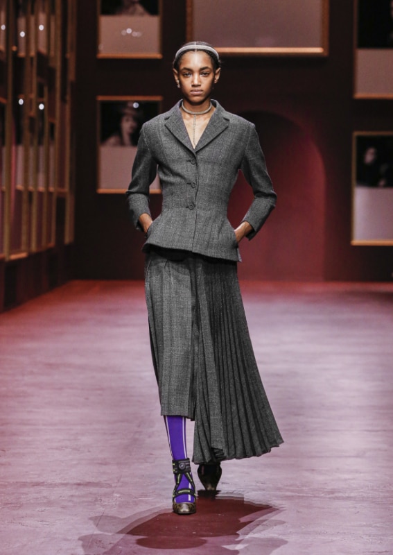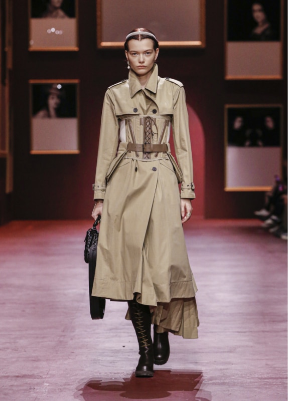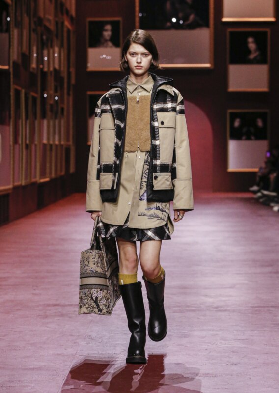 Disegnata da Bureau Betak, la collezione di Maria Grazia Chiuri sfila in una scenografia dettagliata da pareti foderate in velluto rosso e una serie di occhi fissi sul pubblico. Chiuri arruola spesso artiste donne nei propri lavori, trovandoci questa volta di fronte ai ritratti femminili dell’artista italiana Mariella Bettineschi. Le sue opere prendono ritratti femminili canonici dal XVI al XIX secolo – come la Ragazza col turbante di Jan Vermeer – e li reimmaginano con gli occhi tagliati e surrealmente duplicati. Per la prossima stagione, questo si è tradotto in silhouette forti, che hanno visto la Bar Jacket di Dior rielaborata e decostruita in corsetti ispirati dal football americano e stratificati su delicati abiti di pizzo e trench. Vividi guanti da motocross erano abbinati a mantelle, gonne voluminose e abiti camicia, giacche da ciclista e tute da lavoro erano giustapposte a stampe floreali femminili.