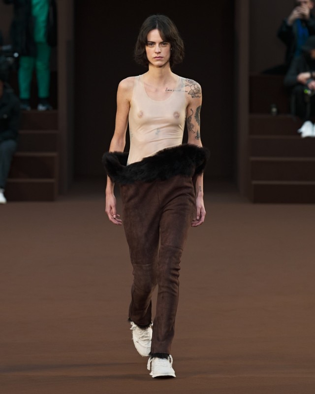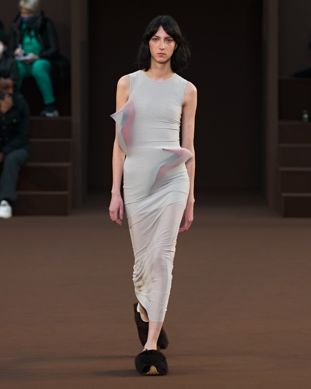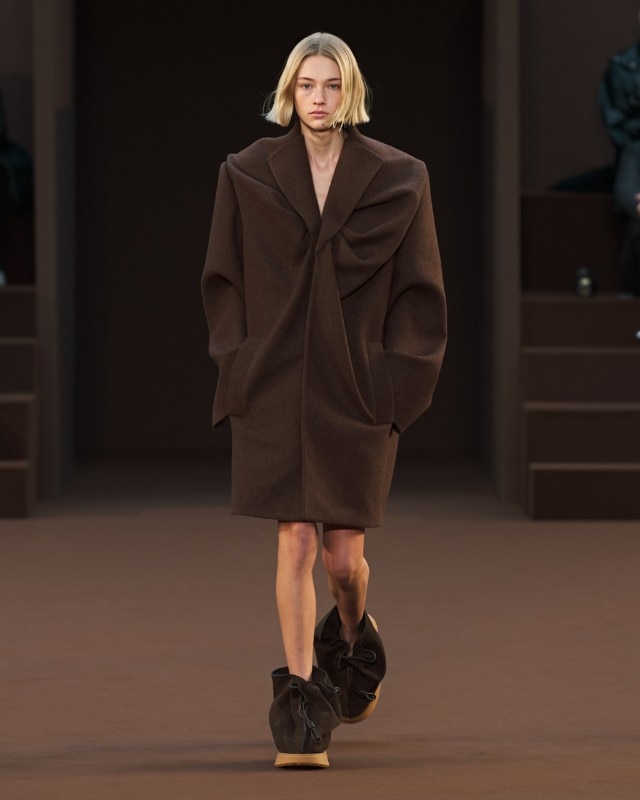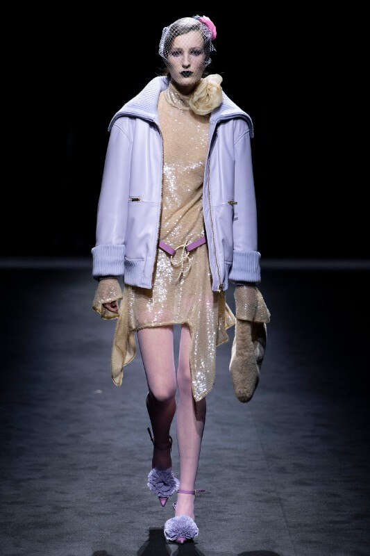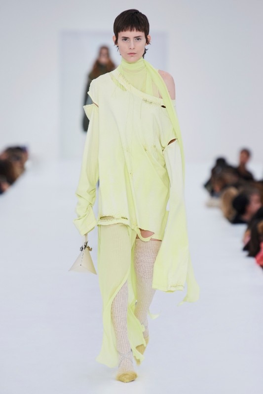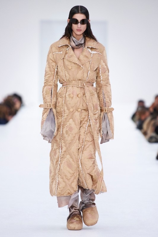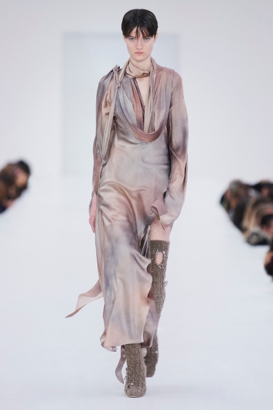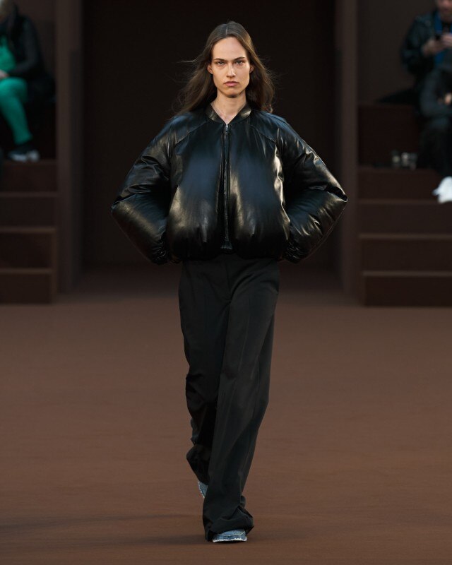 Per la sfilata Acne Studios ha portato un senso di comfort nel suo spazio espositivo. Al Lycée Carnot – il rinomato istituto d'istruzione francese di boulevard Malesherbes, nel 17° arrondissement – , il marchio ha foderato il pavimento del suo set minimalista, dalle pareti bianco ottico agli spazi incassati, simili a salotti per ospitare il suo pubblico, in pelliccia sintetica. Pelliccia che verrà riutilizzata nelle prossime collezioni e donata alla scuola di moda di Parigi Studio Berçot. Da questi saloni incassati il pubblico ha guardato sfilare una collezione che si distingue per l’artigianato, le silhouette a strati, il denim, il broccato floreale e i colori metallici, in una giustapposizione che unisce i tessuti del prêt-à-porter ai materiali per l’arredo, come il jacquard e la schiuma che si utilizza nelle tappezzerie.
