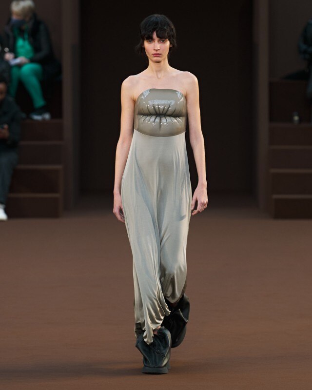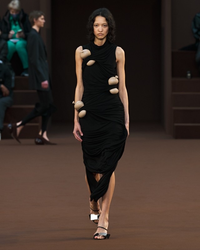 Jonathan Anderson nella collezione Loewe rievoca il caos della genesi, scavando in forme primitive, messe a nudo per rivelare un tocco di kink. Il tatto viene sollecitato – pelle, feltro, latex, tweed, maglia, fibre stampate in 3D, seta, resina – mentre il movimento è catturato in divenire, da oggetti-scultura intrappolati nell’azione – abiti sagomati in pelle, bustini sagomati in feltro, abiti drappeggiati con corazze a forma di labbra o reggiseni a palloncino. Gli ospiti accedono alla sede dell’evento attraverso una riproduzione monumentale di Aquarius di Anthea Hamilton, evocando un’atmosfera surrealista. Composto da un’arena quadrata ricoperta di moquette marrone che alludeva al terreno, lo spazio esponeva le Giant Pumpkins, sempre firmata Hamilton, repliche in scala esatta di vere zucche giganti, tipicamente coltivate per la competizione, realizzate in pelle e prodotte in collaborazione con Loewe.