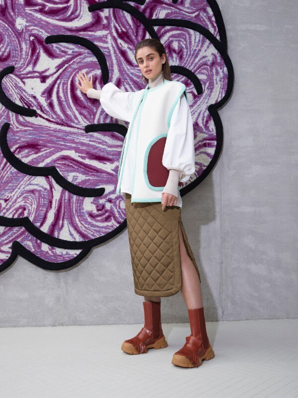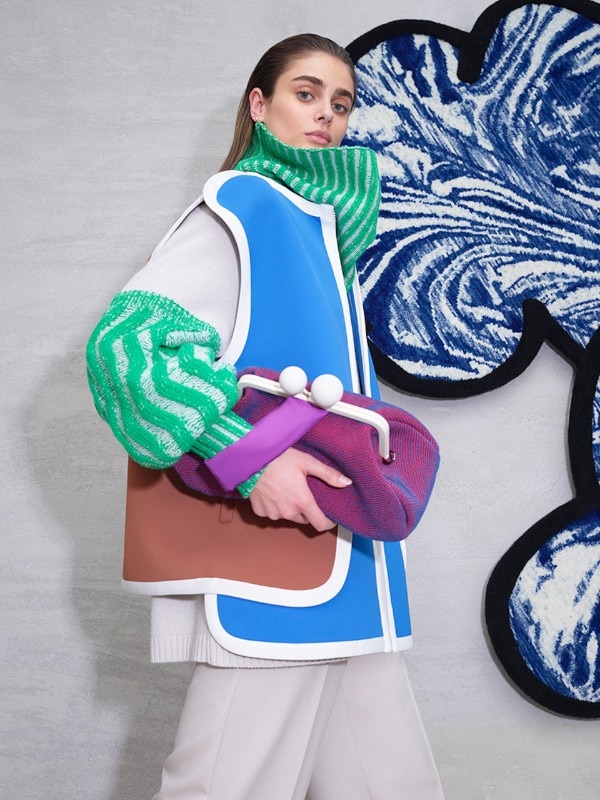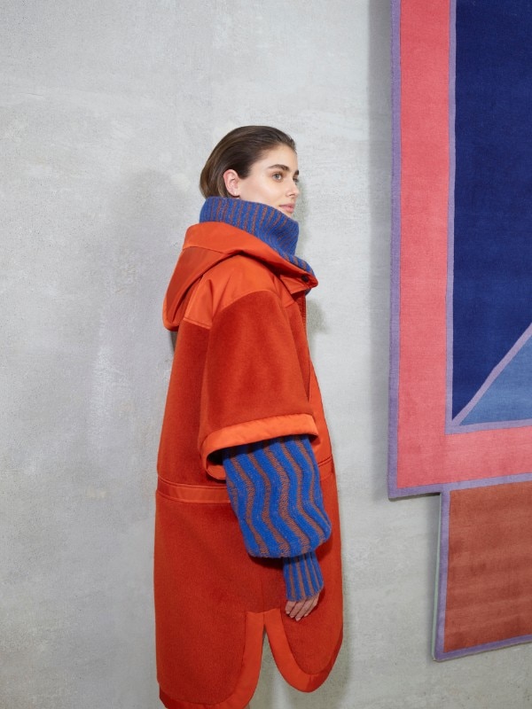 La capsula si intitola Habito, una parola spagnola che significa sia “abitudine” sia “abitare”. Il disegno ha avuto inizio nell’archivio di Max Mara, un luogo che Urquiola era ansiosa di esplorare all'inizio del progetto. La collezione comprende quindi una serie di cappotti in proporzioni variamente amplificate, che combinano tessuti giocosamente giustapposti. Altri elementi includono un gilet dai colori vivaci, che ricorda i suoi tappeti colorati CC-Tapis che hanno fatto da sfondo alla presentazione, borse clutch giganti con chiusura a scatto e camicie con ampie maniche plissé. Il risultato, quindi, è un insieme di micro-architetture da abitare che prende forma e significato in una fusione di caratteri dove, a guidare la libera contaminazione, è una serie precisa di abbinamenti e giochi di contrasto tra colori, texture e persino parti dei capi d’abbigliamento.