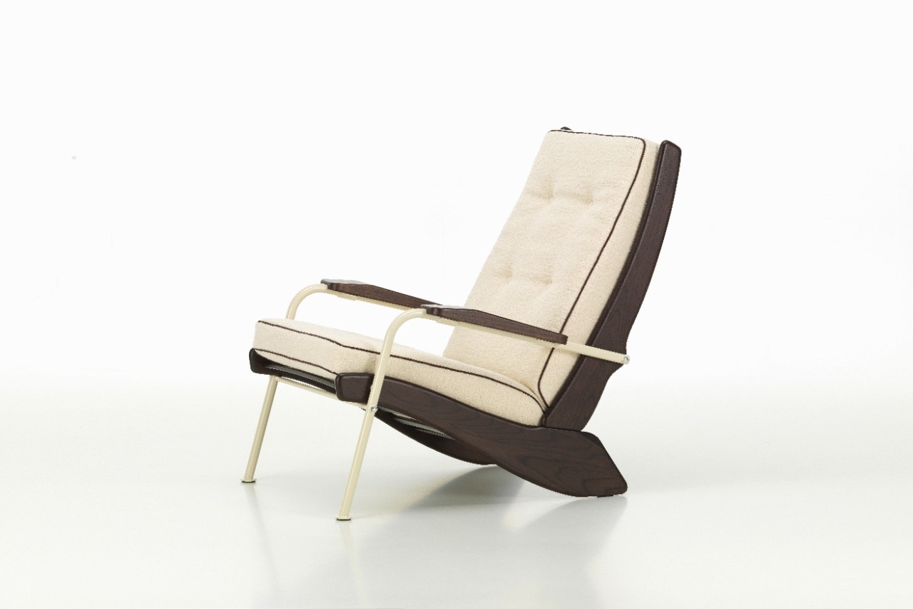 Risale al 1948 un’affascinante poltroncina dalla struttura in legno, con lo schienale alto e inclinato in tubolare d’acciaio. La seduta fa la sua comparsa, in una forma che andrà poi evolvendosi, sulle pagine di Domus nel giugno del 1953 (Domus 283), in una proposta di “mobili in serie” per un soggiorno, descritta sinteticamente nelle sue componenti – “con imbottitura rimovibile in gomma piuma” – accanto a mensole, sedie e tavoli che diventeranno poi i simboli distintivi del suo design pratico e austero. La poltrona è un incontro tra materiali diversi, che Prouvé associa con consapevolezza, grazie alla sapienza artigiana e alla volontà di perseguire un design funzionale: le gambe posteriori, dai profili marcati, sostengono il peso, mentre la parte anteriore è alleggerita dalle gambe in tubolare di ferro.