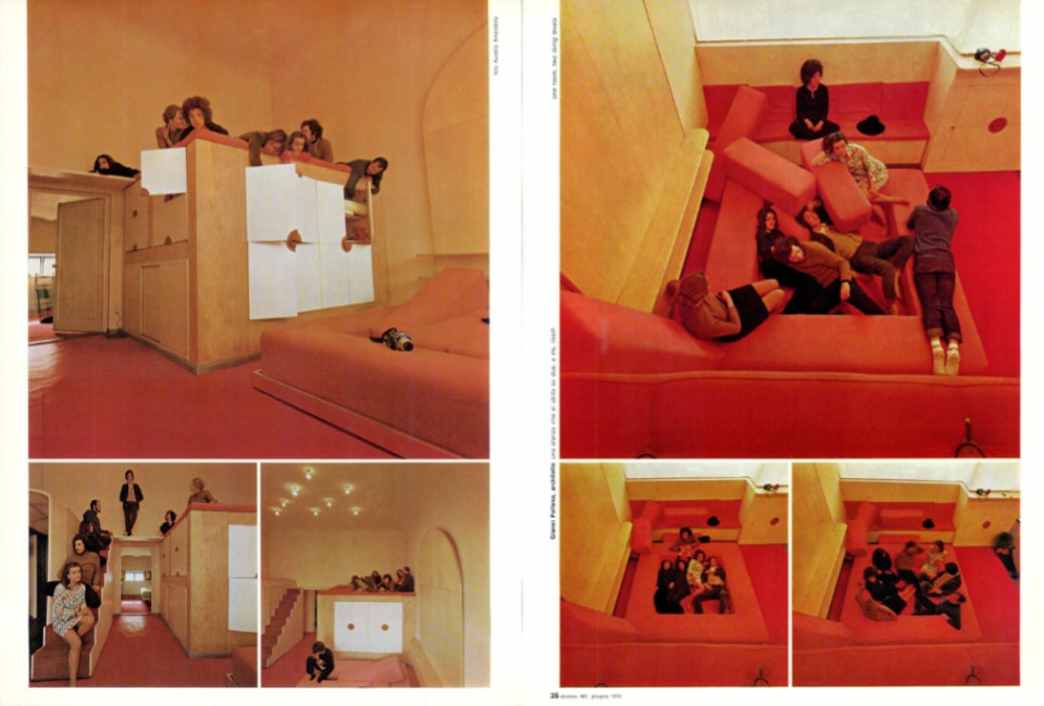 Giovane studente di architettura, aveva preso in affitto l’ex atelier di un pittore, luminoso e dai soffitti alti, per capire se, in fondo, fosse un po’ artista anche lui. Nella casa non c’era nulla, solo una sedia da giardino verde, e il telefono: progettare Rumble significava “occupare gli spazi vuoti” e ricostruire un luogo dove poter interagire e conoscersi, “uno spazio umano in cui si potesse stare, e ognuno entrandovi potesse essere sincero se lo voleva. Oppure potesse fuggirne se non ci riusciva”, raccontava su Domus nel 1970, aiutato dalle coloratissime fotografie di Aurelio Amendola, con gli amici accomodati tra i cuscini smontabili che occupano l’intera stanza.