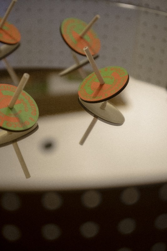 Nel ventre di questo grande volume su ruote, seminascosta come un insieme ancora più prezioso, c'è una sorprendente collezione di trottole, gioco antichissimo, tanto semplice - nel gesto, nell'attività e nella meraviglia - quanto complesso - nel giusto slancio, nel bilanciamento del corpo e nella durata della rotazione. Uno di quei giochi che anche ogni adulto non perde occasione di attivare, per un salto nel passato più remoto o nel futuro più prossimo.