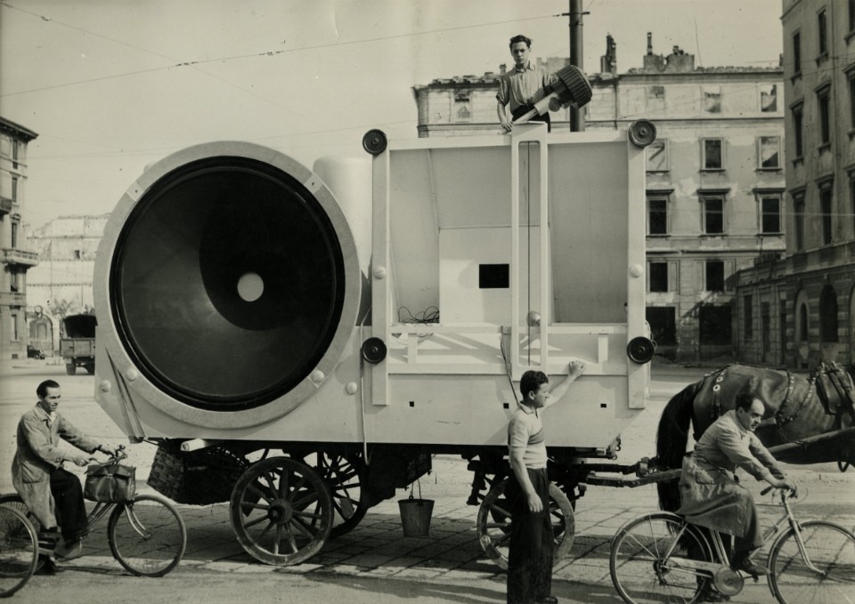 Immagine di apertura: Radio Fuoriscala pronta per essere appesa all'esterno della Triennale di MIlano per la 15° Mostra Nazionale della Radio del 1948. Progetto A.e P.G. Castiglioni. Courtesy Fondazione Achille Castiglioni