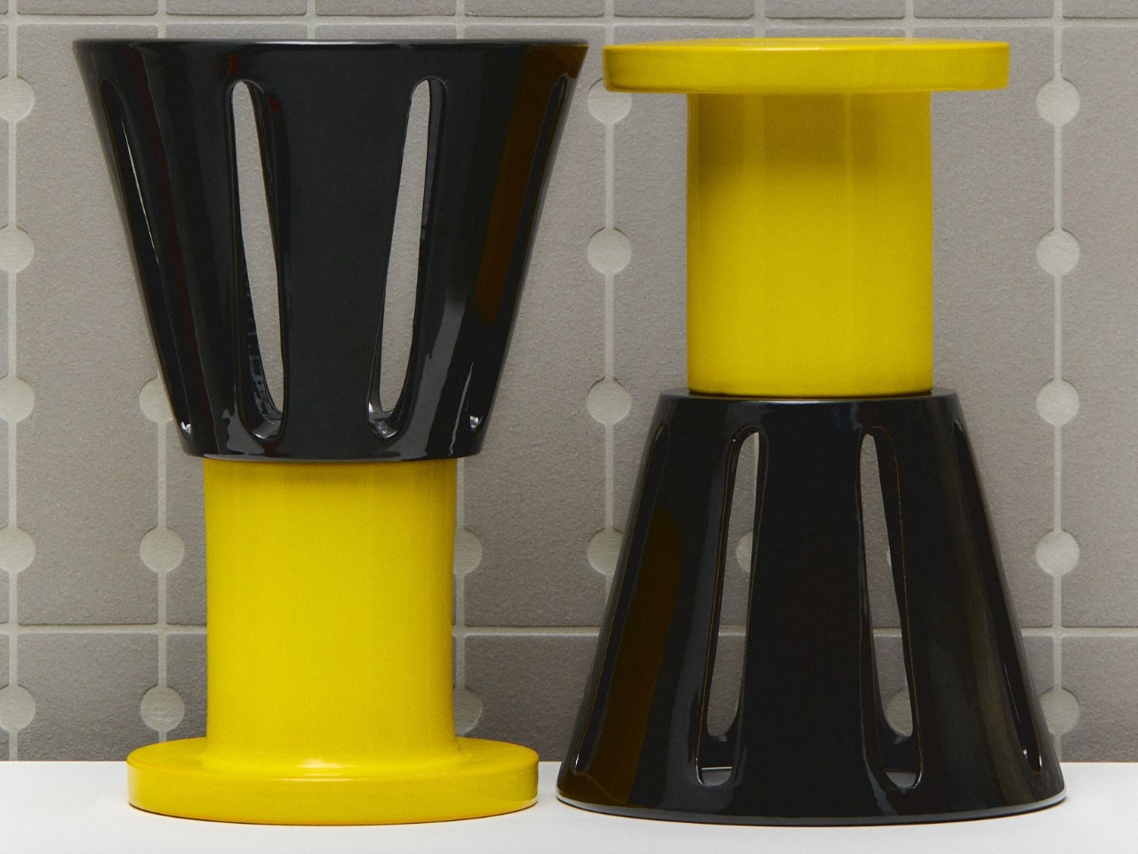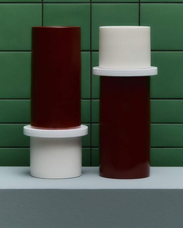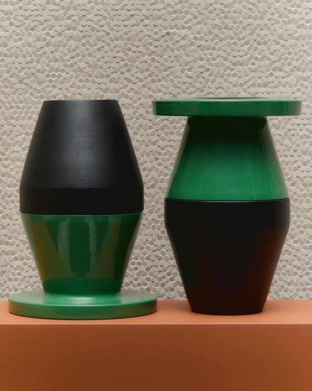 Coppie di Fatto prosegue su questa linea, di ironia e sperimentazione. La collezione comprende sette coppie di oggetti in ceramica, realizzati a mano al tornio secondo la tradizione artigianale italiana, smaltati a spruzzo con una palette vivace. Ogni vaso è firmato e numerato, e può essere acquistato solo – appunto – in coppia.