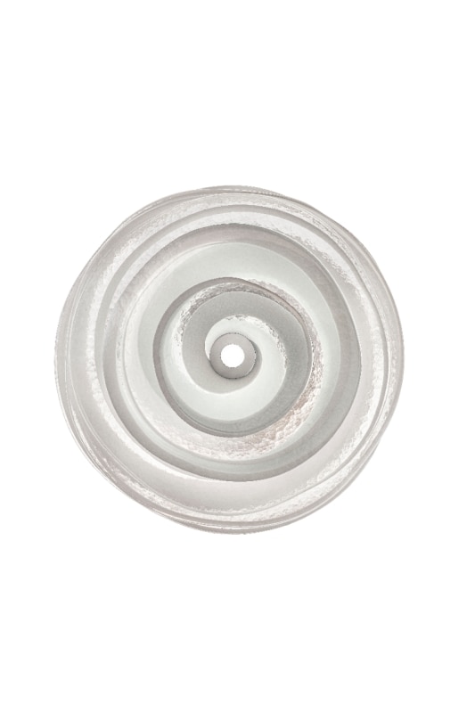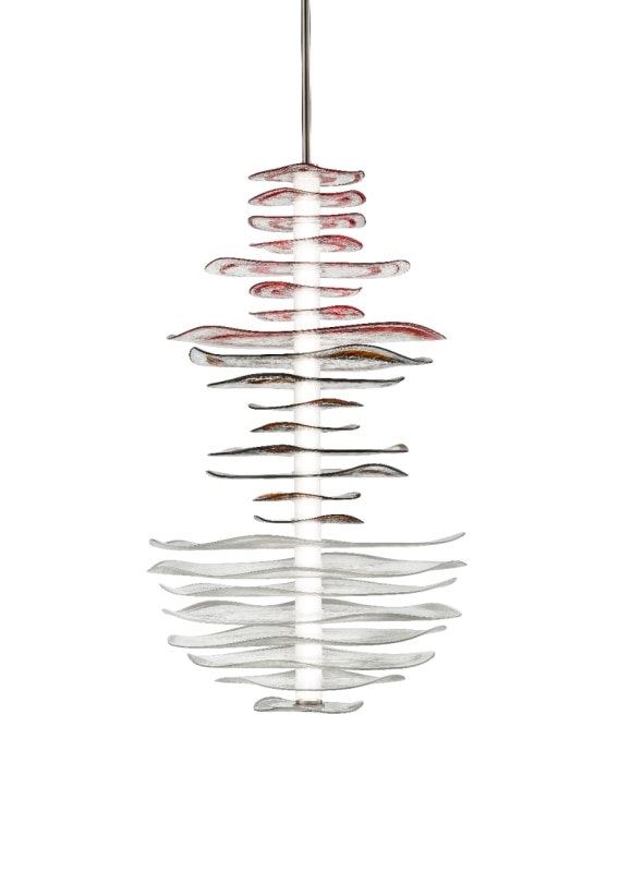 La genesi di Profilo parte da un’idea molto semplice e molto muranese: il vetro centrifugato. Solo che qui la tecnica non è un vezzo tecnico e non serve a produrre un effetto decorativo. I dischi di vetro, tutti diversi per diametro, sono pensati come “segni” lasciati da una forza fisica, quasi come tracce di un movimento che ha modellato la materia - e infatti l’oggetto sembra muoversi. La superficie resta leggermente irregolare, mentre il colore si organizza in spirale lungo il percorso della forza centrifuga. È un pezzo che rende visibile la propria costruzione, e in questa onestà materiale trova la sua dimensione più attuale. Il punto luminoso centrale agisce come un nucleo che tiene insieme l’intero sistema: un cuore che diffonde la luce e la fa filtrare attraverso i dischi, ammorbidendola e restituendole una vibrazione che non ha bisogno di artifici tecnologici. La tecnologia c’è, ma sta al servizio della trasparenza, della stratificazione, dell’aria tra un elemento e l’altro in modo che Profilo non possa essere considerato un esercizio formale.