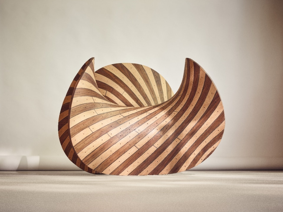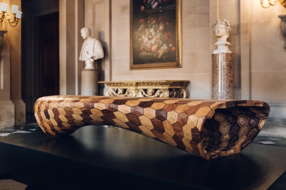 La Ply Loop Chair è un altro tassello fondamentale nel percorso dello studio: una spirale continua in rovere e noce, tenuta insieme da una bio-resina sviluppata con Plantics, resine e materiali termoindurenti al 100% di origine biologica, completamente biodegradabile e riciclabile all’infinito. È un oggetto che sembra provenire da un laboratorio di fisica più che da una falegnameria, eppure nasce dalla logica del materiale stesso. E poi c’è la vertigine digitale dei Voxel Tables (2023): architetture pixelate, costruite voxel dopo voxel, come se l’arredo avesse attraversato un videogioco degli anni ’90 prima di tornare poi al mondo fisico. Il tavolo, in resina e neodimio (elemento chimico, numero atomico 60), è una superficie che oscilla tra ornamento barocco e modellazione computazionale estrema.
