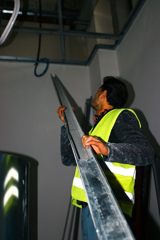 Quello della guida per cartongesso è un profilo standard e modulare, difficile da lavorare e da differenziare, su cui Larcher e D’Andrea hanno scelto di intervenire il meno possibile. “L’idea era quella di lavorare per sottrazione”, racconta Larcher a Domus, “mantenendo la guida sempre riconoscibile come elemento tecnico”. Le modifiche si limitano quindi a tagli e piegature mirate, applicate solo quando davvero necessarie.