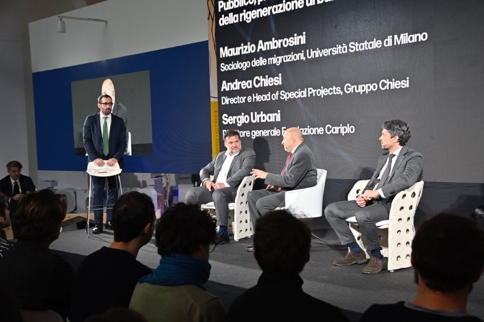 Massimo Valz-Gris modera Maurizio Ambrosini, sociologo delle migrazioni, Università Statale di Milano; Andrea Chiesi, Director and Head of Special Projects, Chiesi Group; Sergio Urbani, direttore generale Fondazione Cariplo.