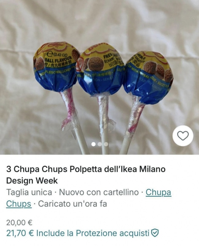 In vendita online ci sono anche i lecca-lecca nati dalla collaborazione tra Chupa Chups e Ikea, al gusto dell’iconica polpetta del marchio svedese — ormai protagonista di intere collezioni di design e delle collaborazioni più disparate. Anche se lo stesso gadget sarà distribuito gratuitamente negli store Ikea a partire da giugno (ed era già gratuito all’evento del brand in Spazio Maiocchi), i prezzi oscillano tra i 16 e i 22 euro.